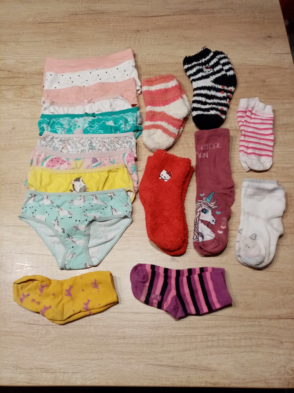 nošené, 9x kalhotky lupilu i jiné s obrázky (hvězdičky, králíčci, ovoce, zebra, jednorožec, srdíčka...) vel. 98/104, 4x slabé ponožky (1x jednorožec), 1x podkolenky jednorožec, 3x teplé (2x hello kitty)