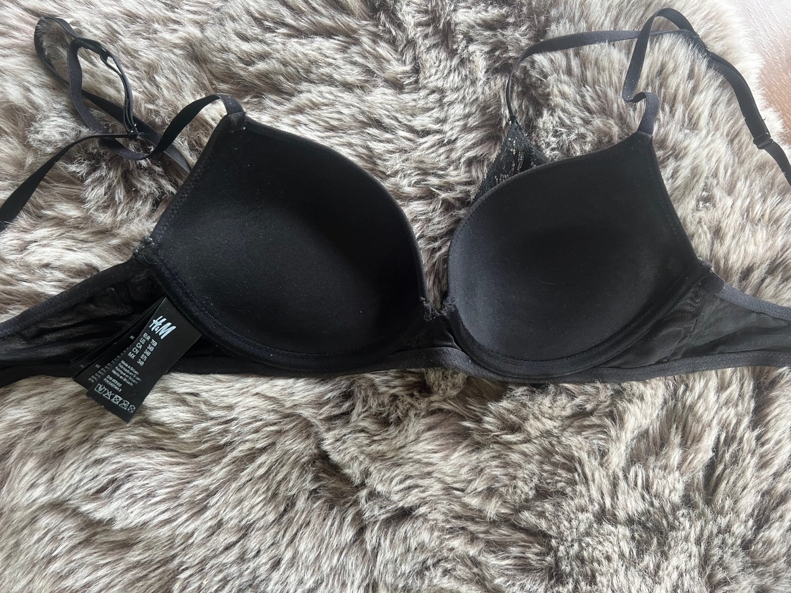 Visačku jsem odstřihla a nepamatuji si značku. Kupovala jsem v Halfprice. bez zapínání. Košíčky jsou lehce vatované. Velmi hezká a sluší. Oblečená asi třikrát. Bez vad. Černá je krásně sytá.