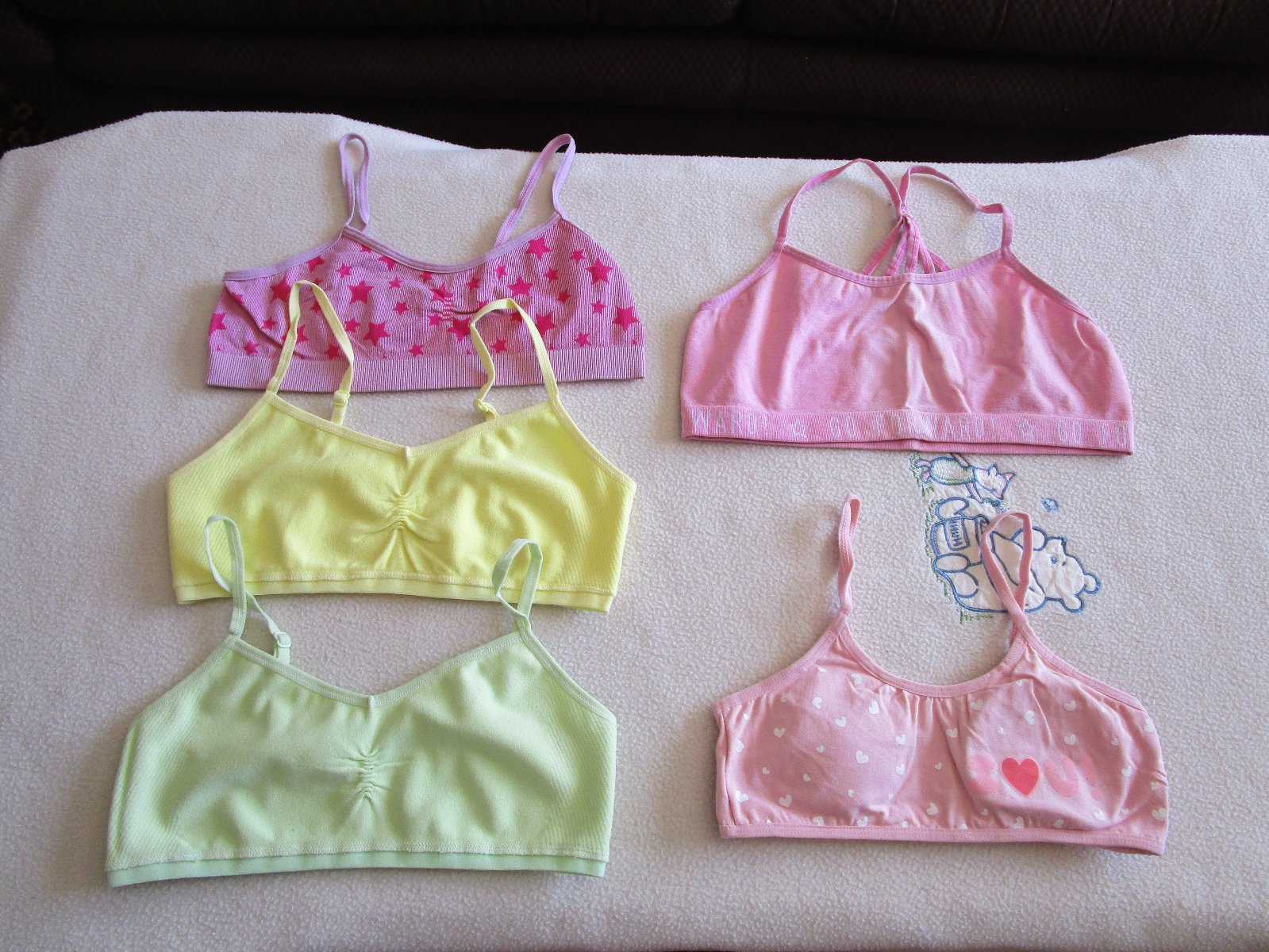 5x bavl. sportovní elast. podprsenka - lambáda, vel. 146-152, z toho 2x téměř nová z Primarku, cena celkem jen 99 Kč.