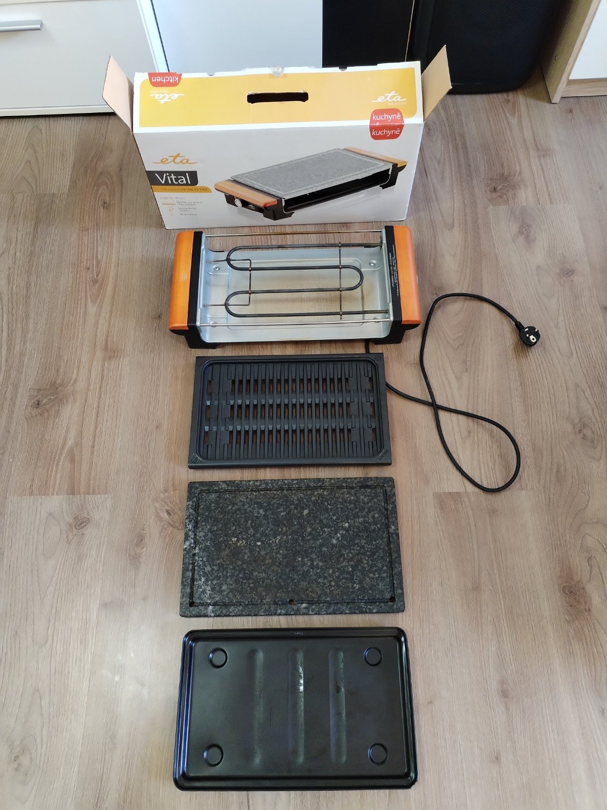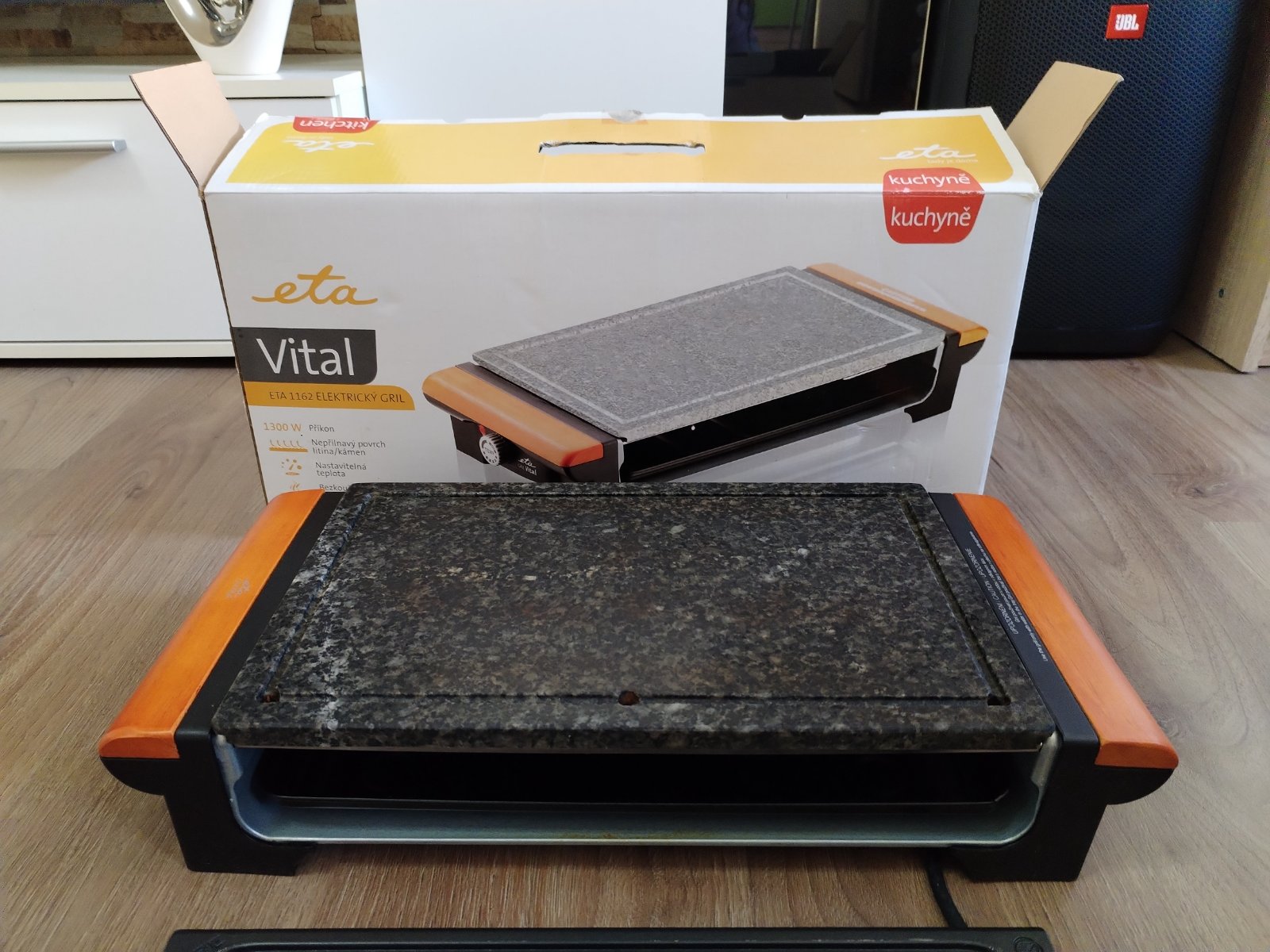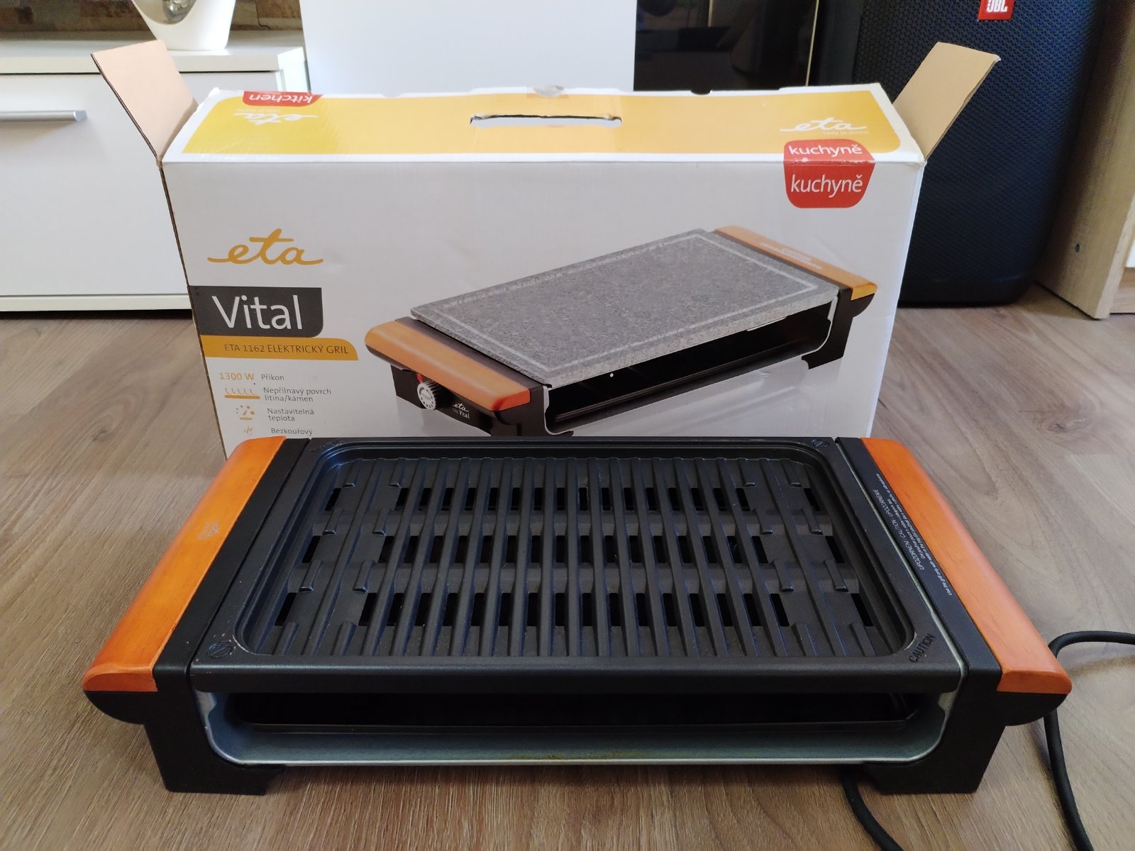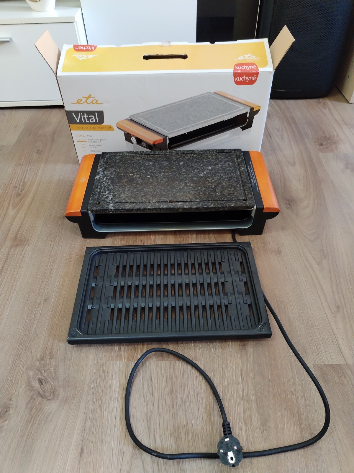 elektrický otevřený stolní gril kamenná deska a žebrovaný slitinový rošt rozměry grilovací plochy 23,5 x 36,5 cm příkon 1300 W výměnné desky plynulá regulace teploty termostat tác pro odtok tuku světelná signalizace ohřevu a ukončení procesu snadno omyvatelný povrch protiskluzové nožičky. Stolní gril ETA Vital potěší milovníky jak propečených, tak krvavých steaků. Díky vyměnitelným deskám kamenné pro pomalejší, propečenější grilování a slitinové pro rychlou přípravu rare steaků je úžasně univerzální a přizpůsobí se vašim preferencím. Plynule regulovatelná teplota vám umožní grilovat maso, mořské plody i citlivou zeleninu. Potraviny nebudou mastné, vysušené ani pokryté ohořelým, připáleným kořením, nebudete se ani dusit kouřem bezkouřový systém odvede tuk a vodu do odnímatelného tácu ve spodní části grilu. Vyměnitelné desky: slitinová a kamenná
