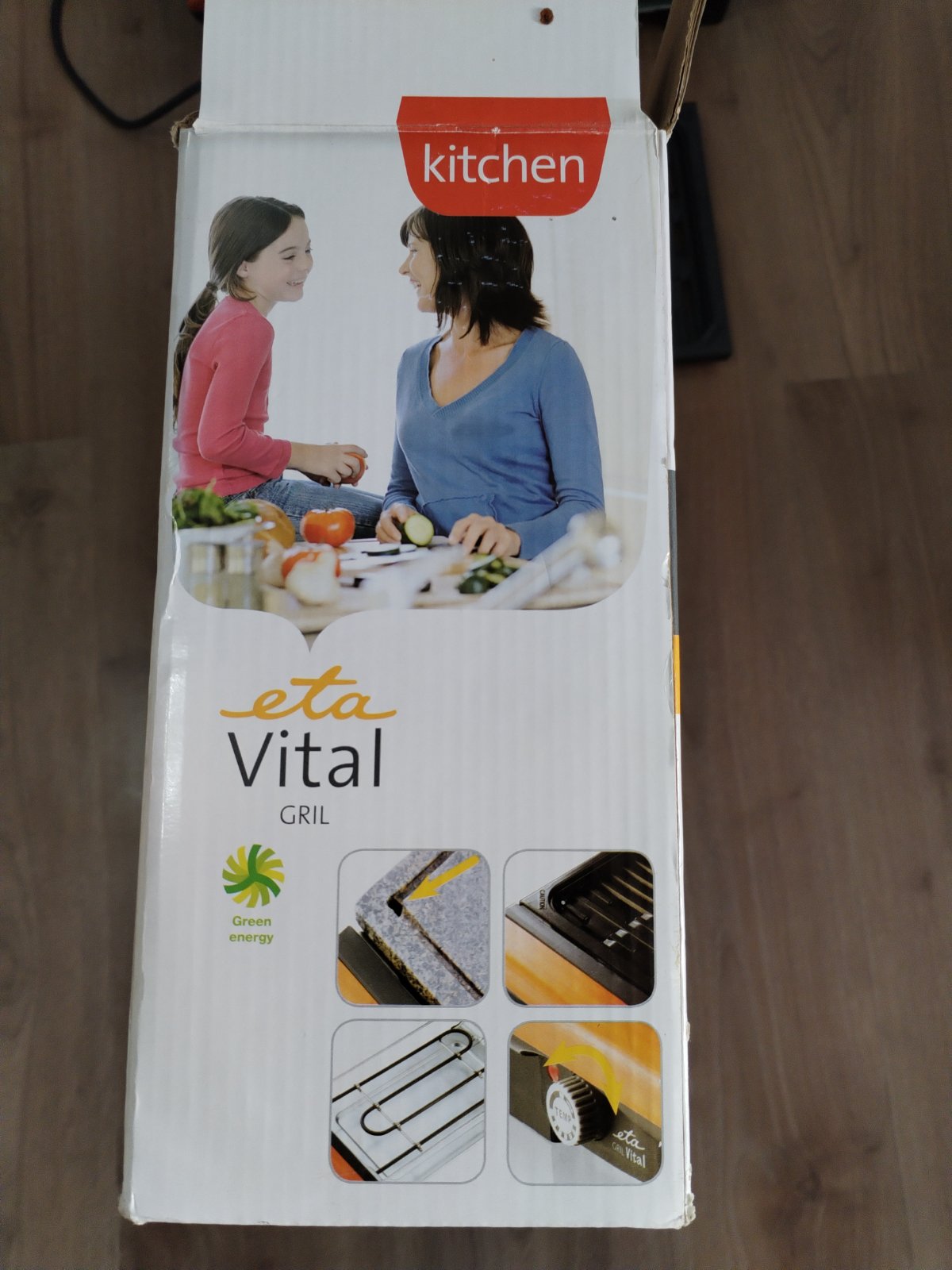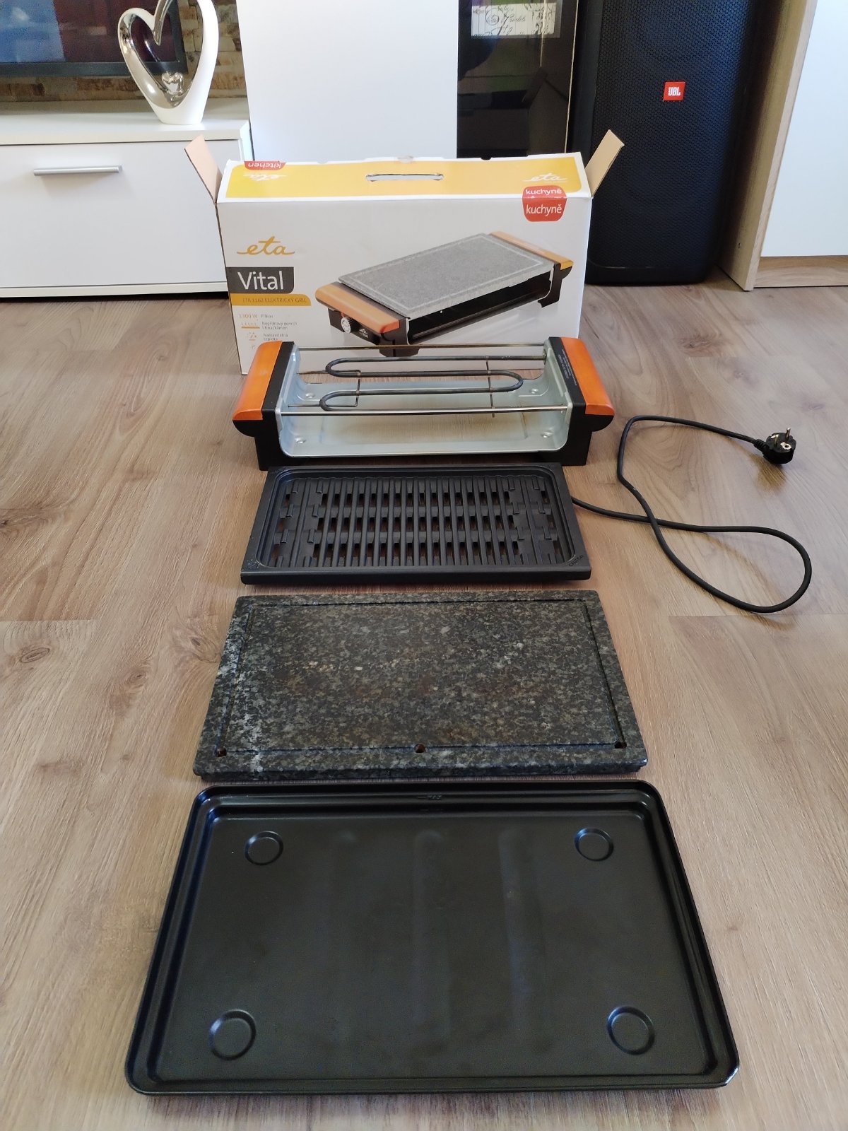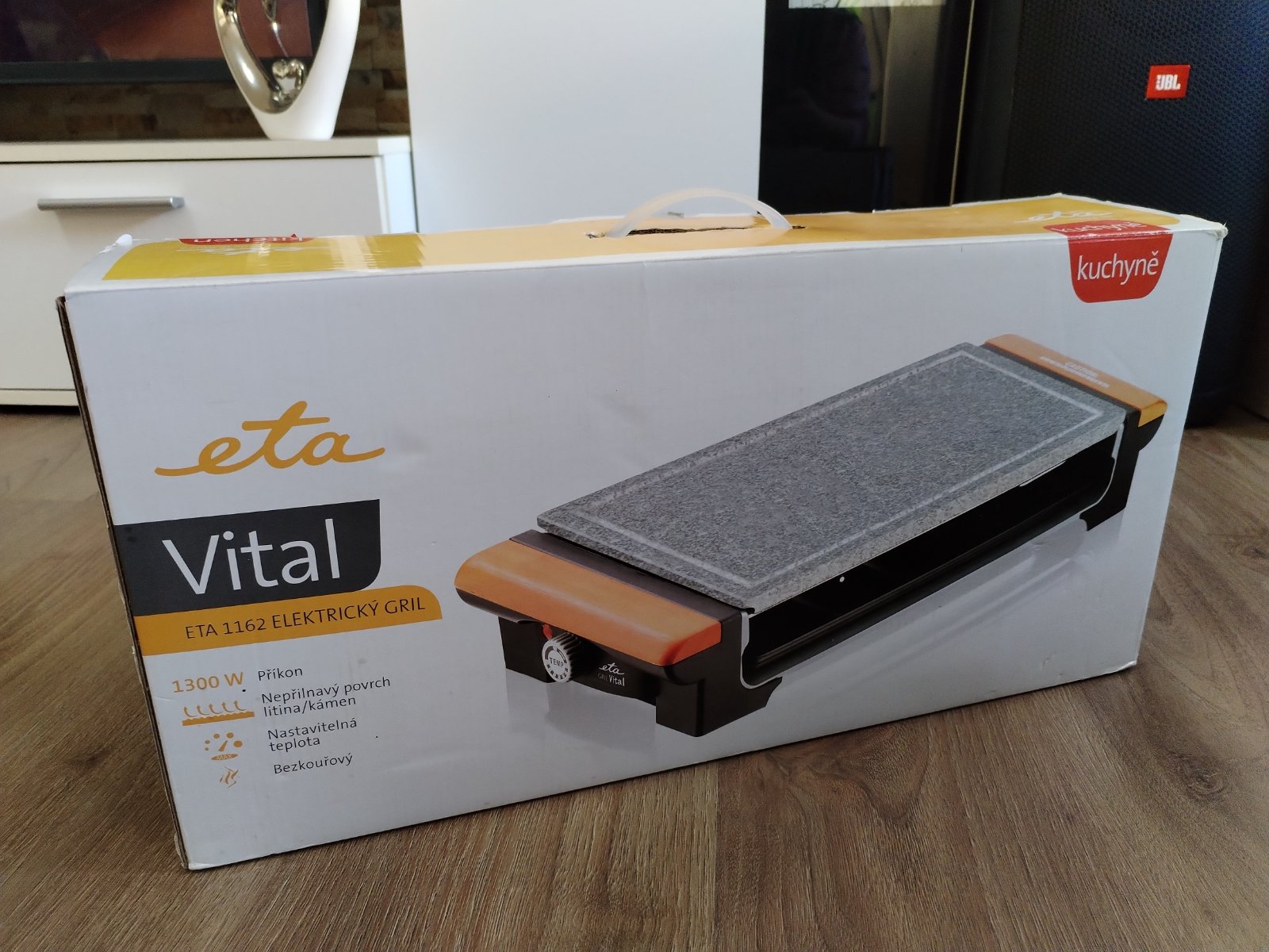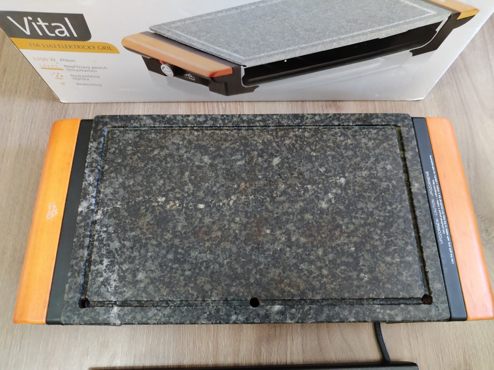 elektrický otevřený stolní gril kamenná deska a žebrovaný slitinový rošt rozměry grilovací plochy 23,5 x 36,5 cm příkon 1300 W výměnné desky plynulá regulace teploty termostat tác pro odtok tuku světelná signalizace ohřevu a ukončení procesu snadno omyvatelný povrch protiskluzové nožičky. Stolní gril ETA Vital potěší milovníky jak propečených, tak krvavých steaků. Díky vyměnitelným deskám kamenné pro pomalejší, propečenější grilování a slitinové pro rychlou přípravu rare steaků je úžasně univerzální a přizpůsobí se vašim preferencím. Plynule regulovatelná teplota vám umožní grilovat maso, mořské plody i citlivou zeleninu. Potraviny nebudou mastné, vysušené ani pokryté ohořelým, připáleným kořením, nebudete se ani dusit kouřem bezkouřový systém odvede tuk a vodu do odnímatelného tácu ve spodní části grilu. Vyměnitelné desky: slitinová a kamenná
