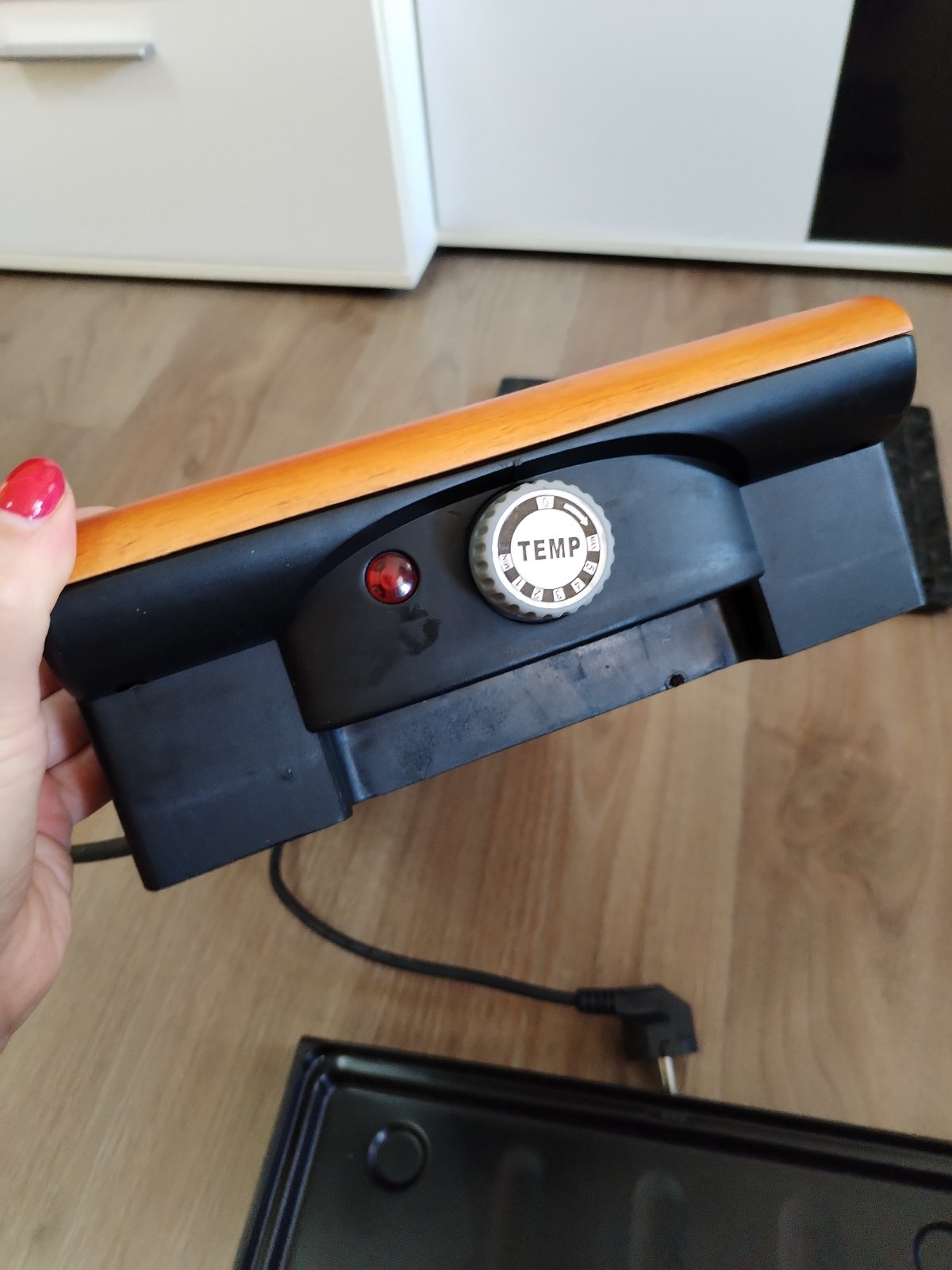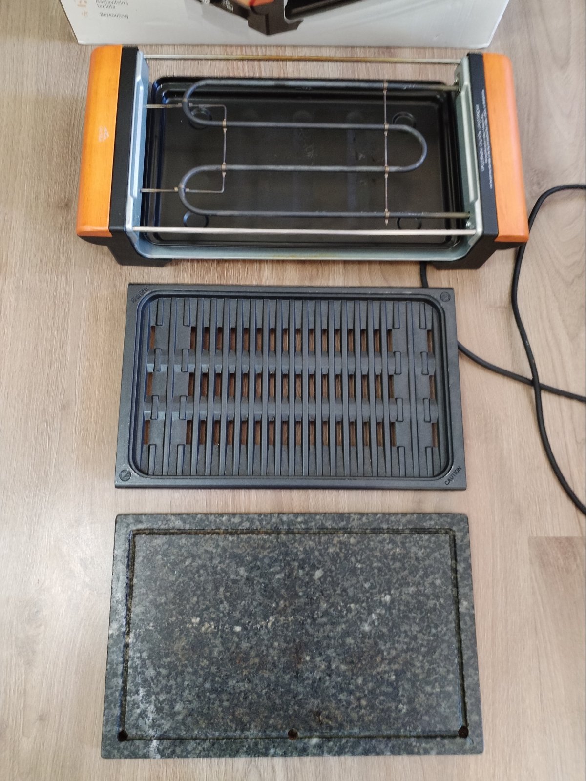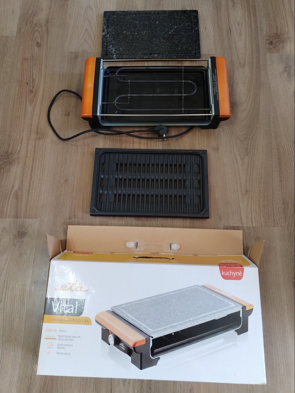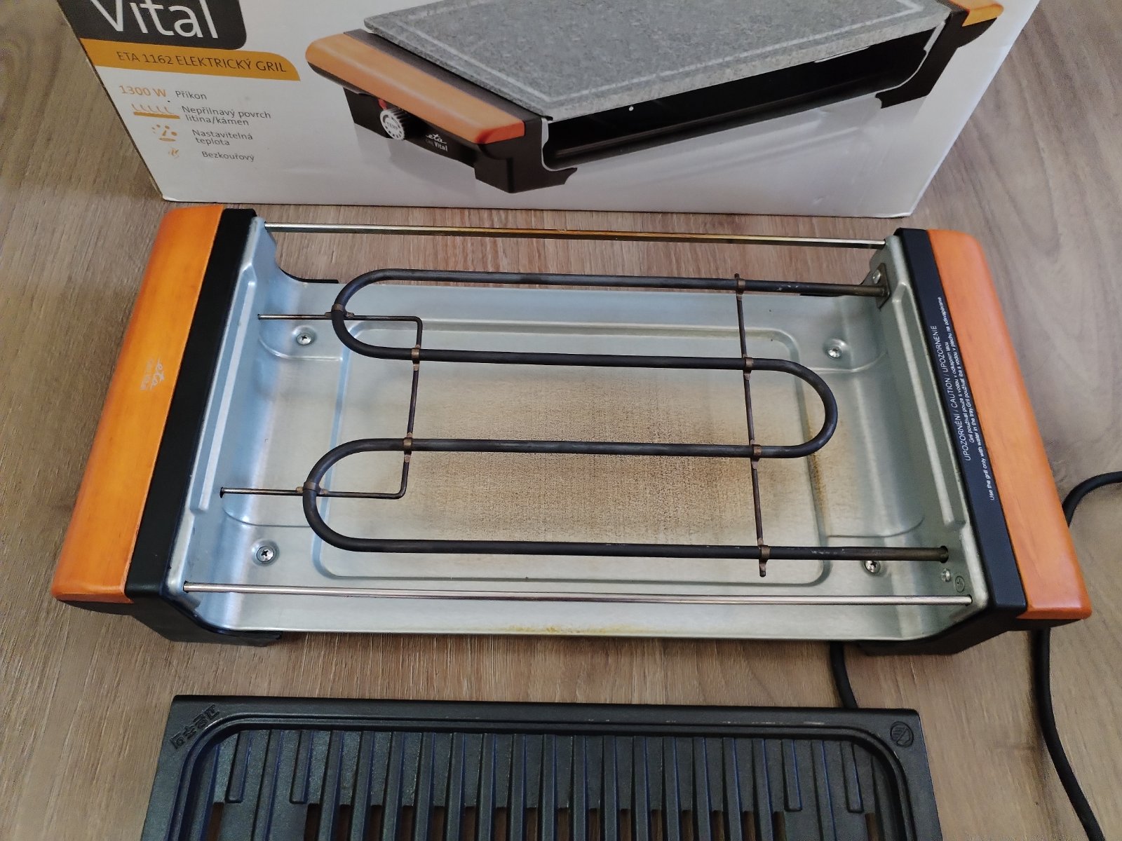 Elektrický otevřený stolní gril ETA Vital 1162 90000 / 1300 W / termostat / 23,5 x 36,5 cm / černá/dřevo