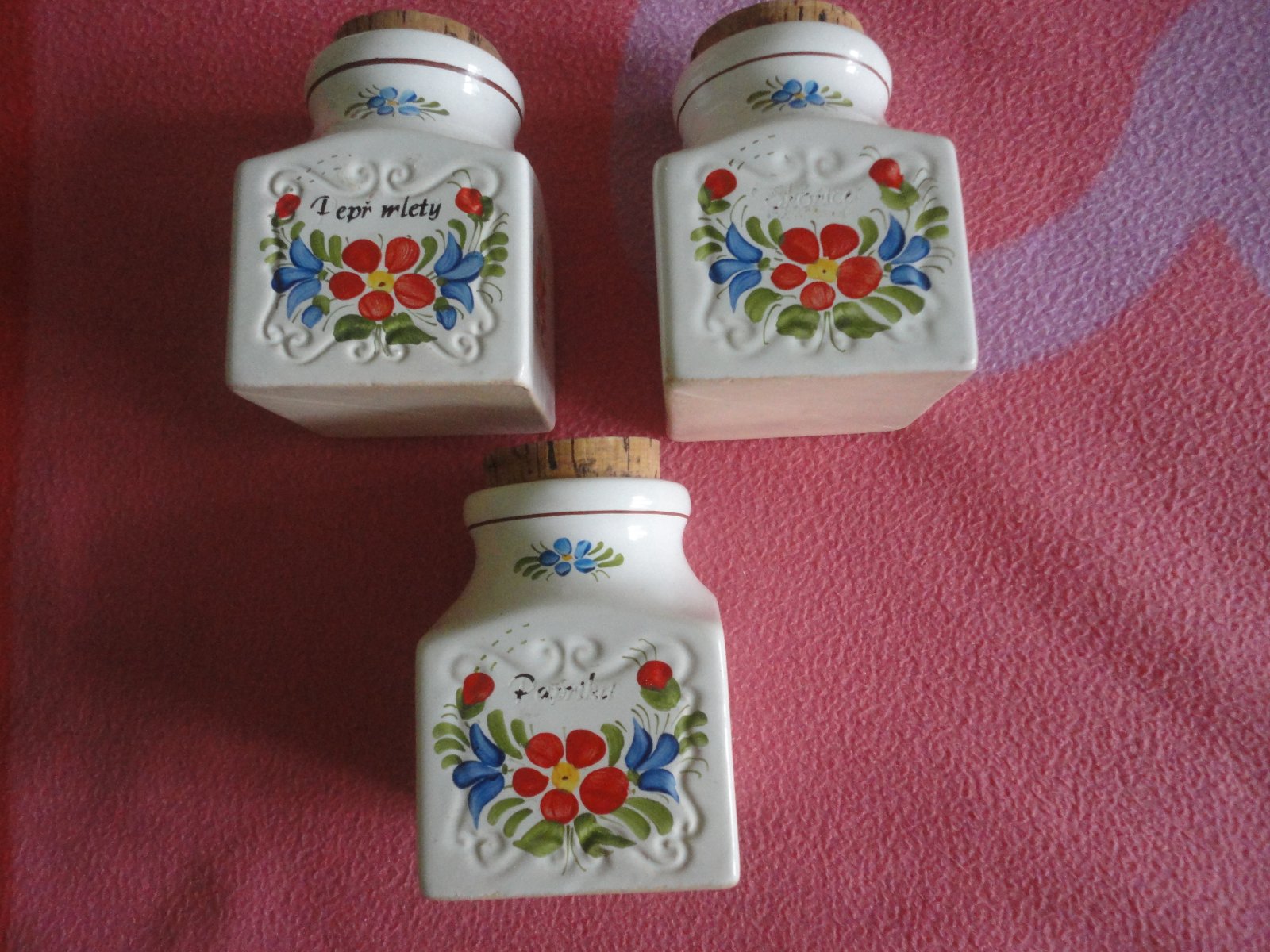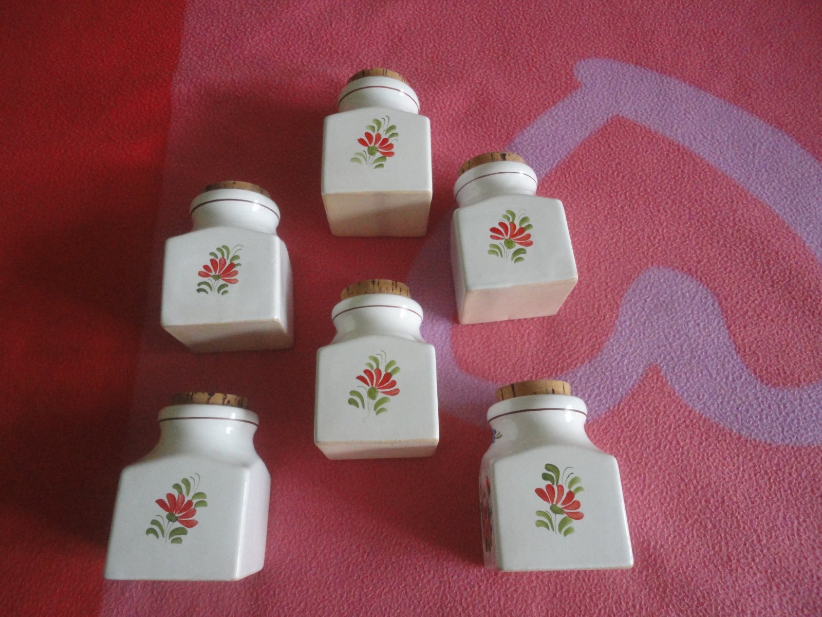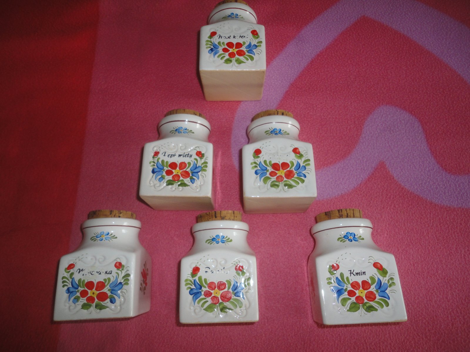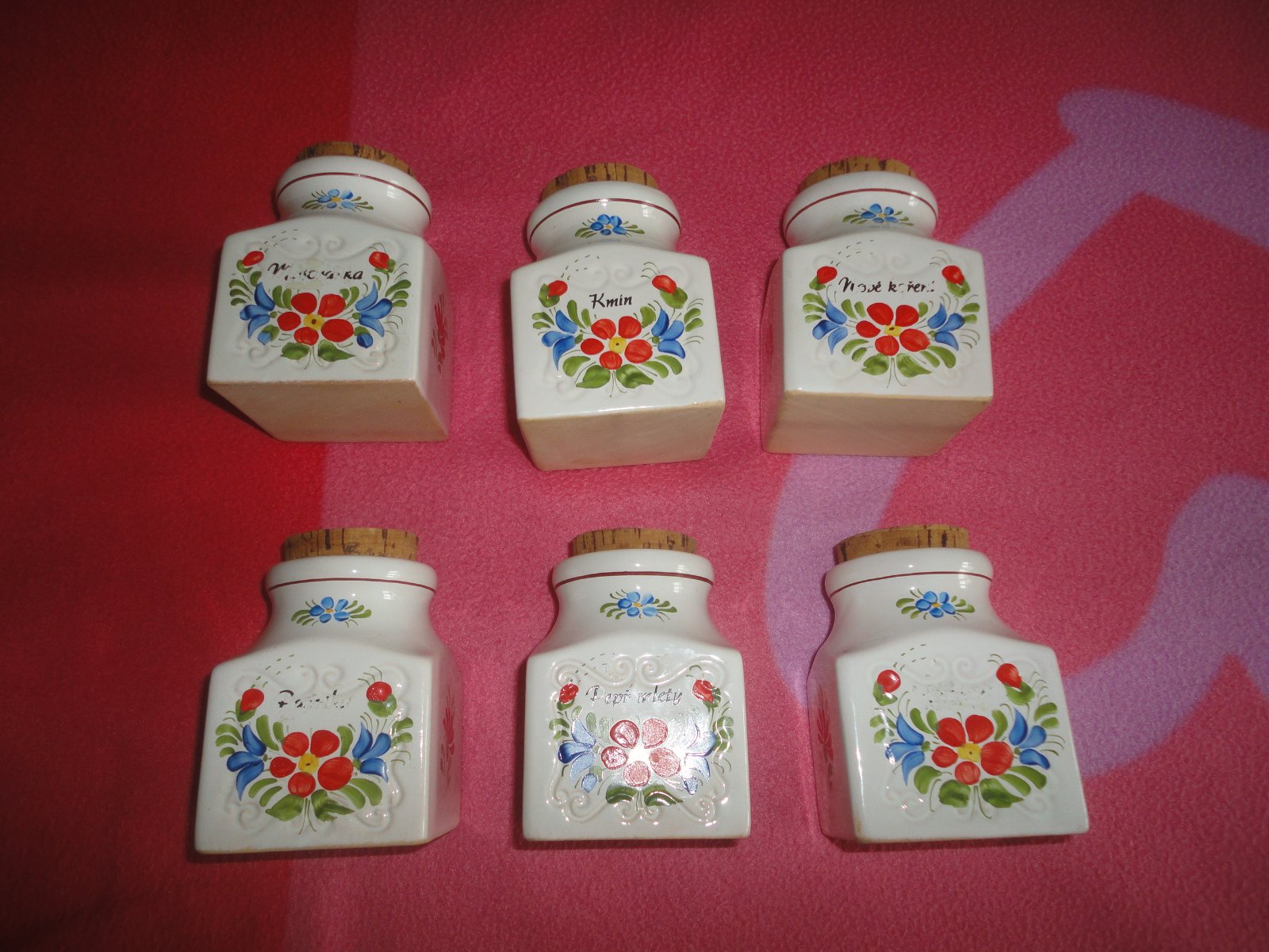 Keramické kořenky vhodné na chalupu - skořice, pepř mletý, paprika, nové koření, majoránka, kmín. Kořenky jsou v pořádku, neobouchané, mají korkovou zátku, motiv je i na bocích, pouze některé popisky je potřeba obtáhnout nesmazatelným fixem, nechávám na novém majiteli, výška 9cm bez zátky