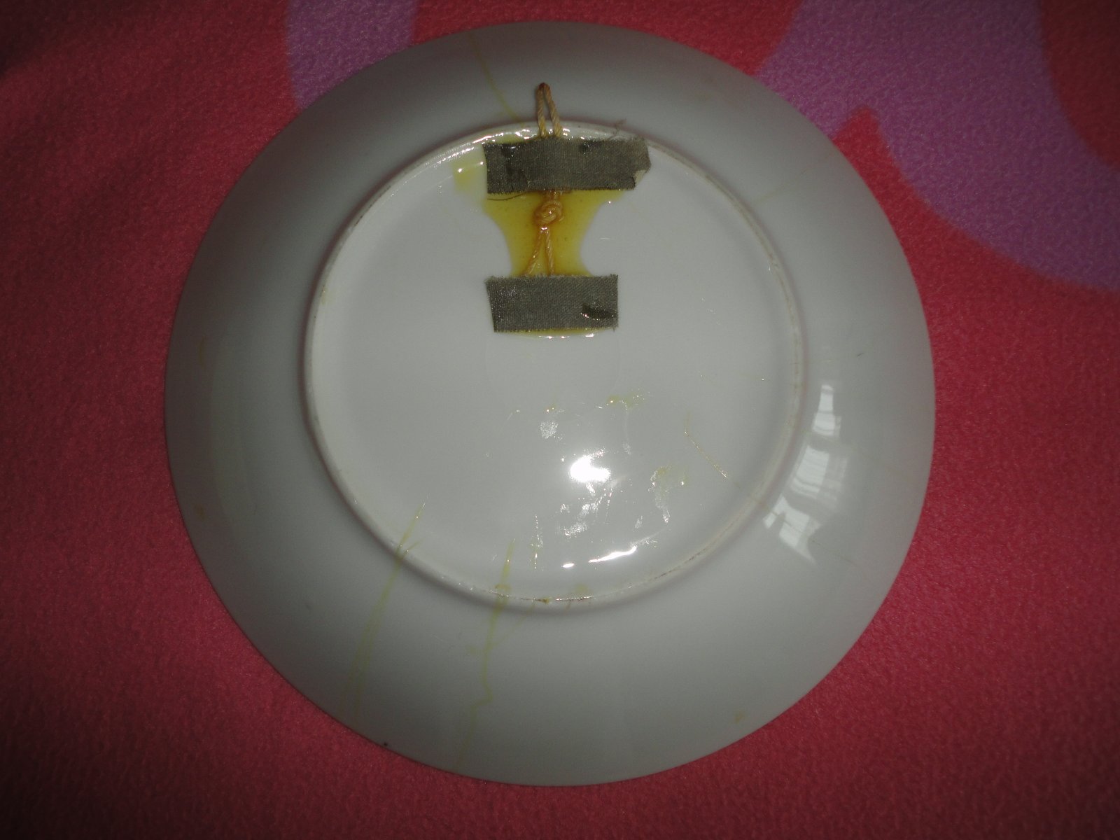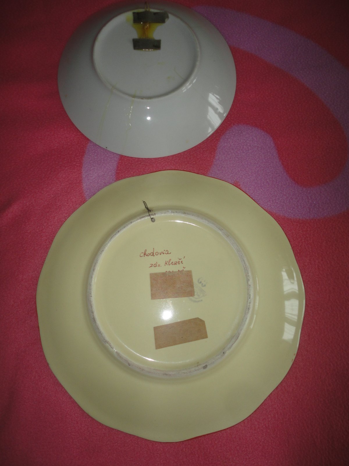 **Malovaný talíř průměr 22cm bez vad, pouze vzadu je místy pokapaný lepidlem, jak přilepovali poutko na zavěšení, cena 50Kč