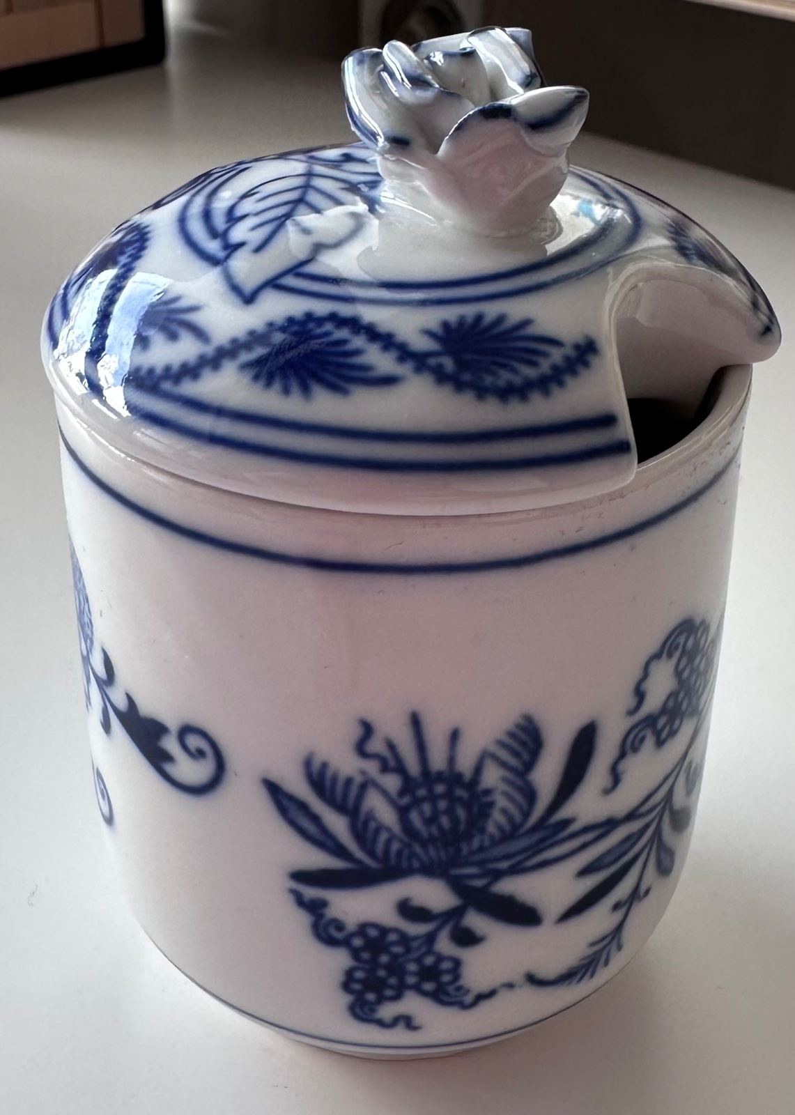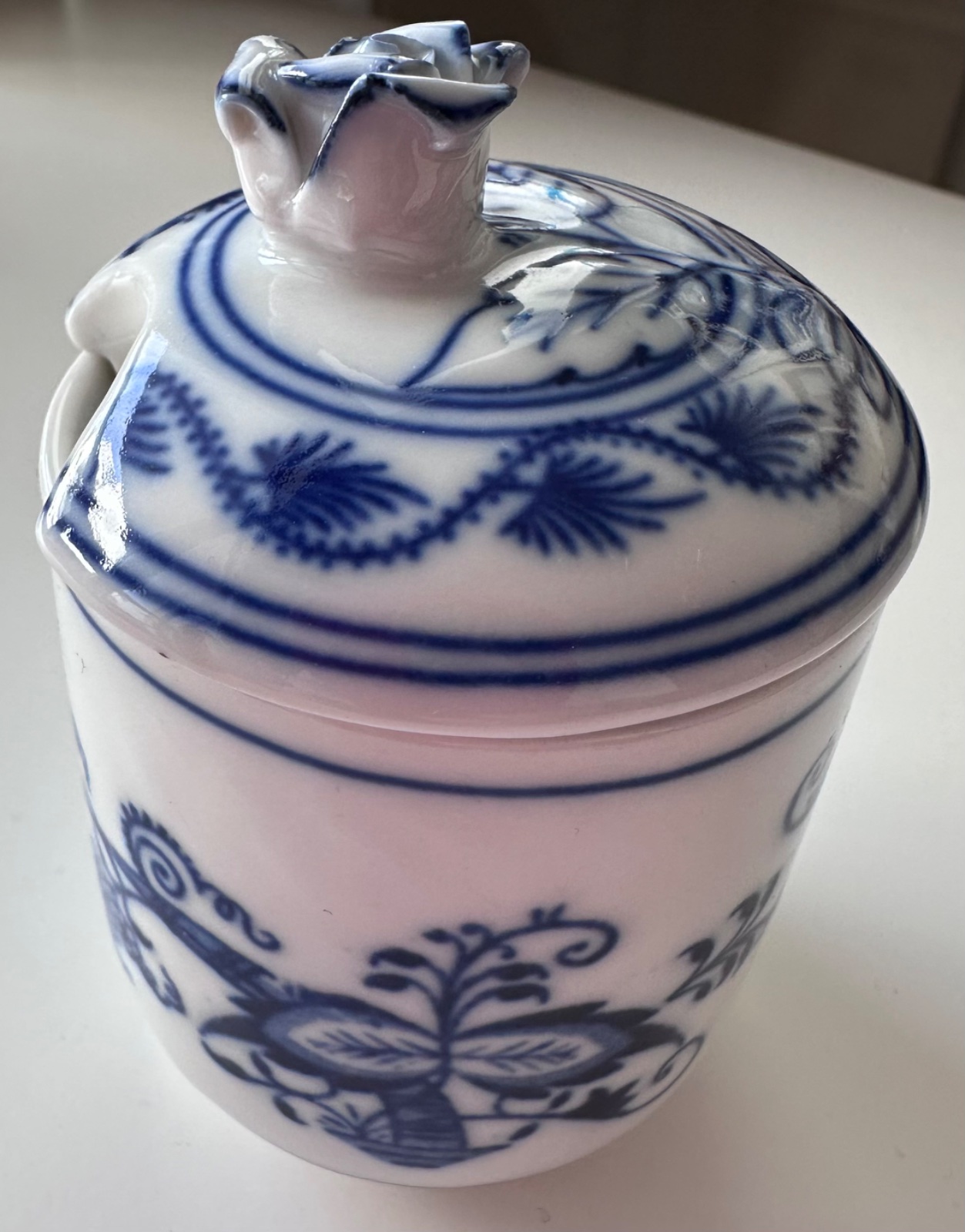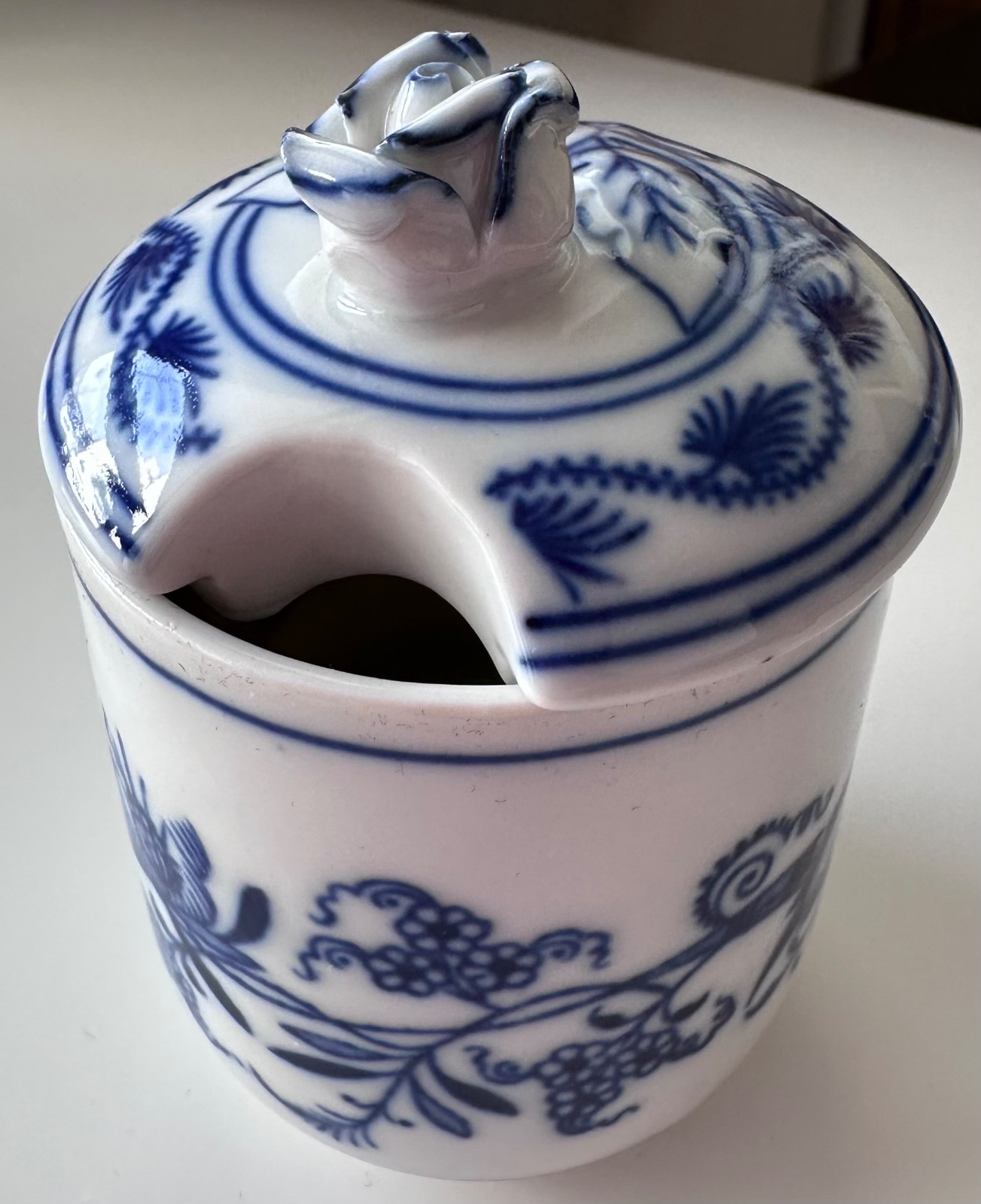 "Budou párečky?" Svou oblíbenou hořčici při kulinářských hodech servírujeme v extra zdobeném hrnku s výřezem pro lžičku (hořčičník) a s víčkem, který má úchytku ve tvaru modelované růžičky. Set, vyrobený z 3 x vypalovaného porcelánu je výrobkem české porcelánky v Dubí u Teplic, firmy s dlouhou tradicí. Kultura stolování je zachována a my si opravdu pochutnáme! Tento originální cibulákový porcelán můžeme mýt v myčce na nádobí.