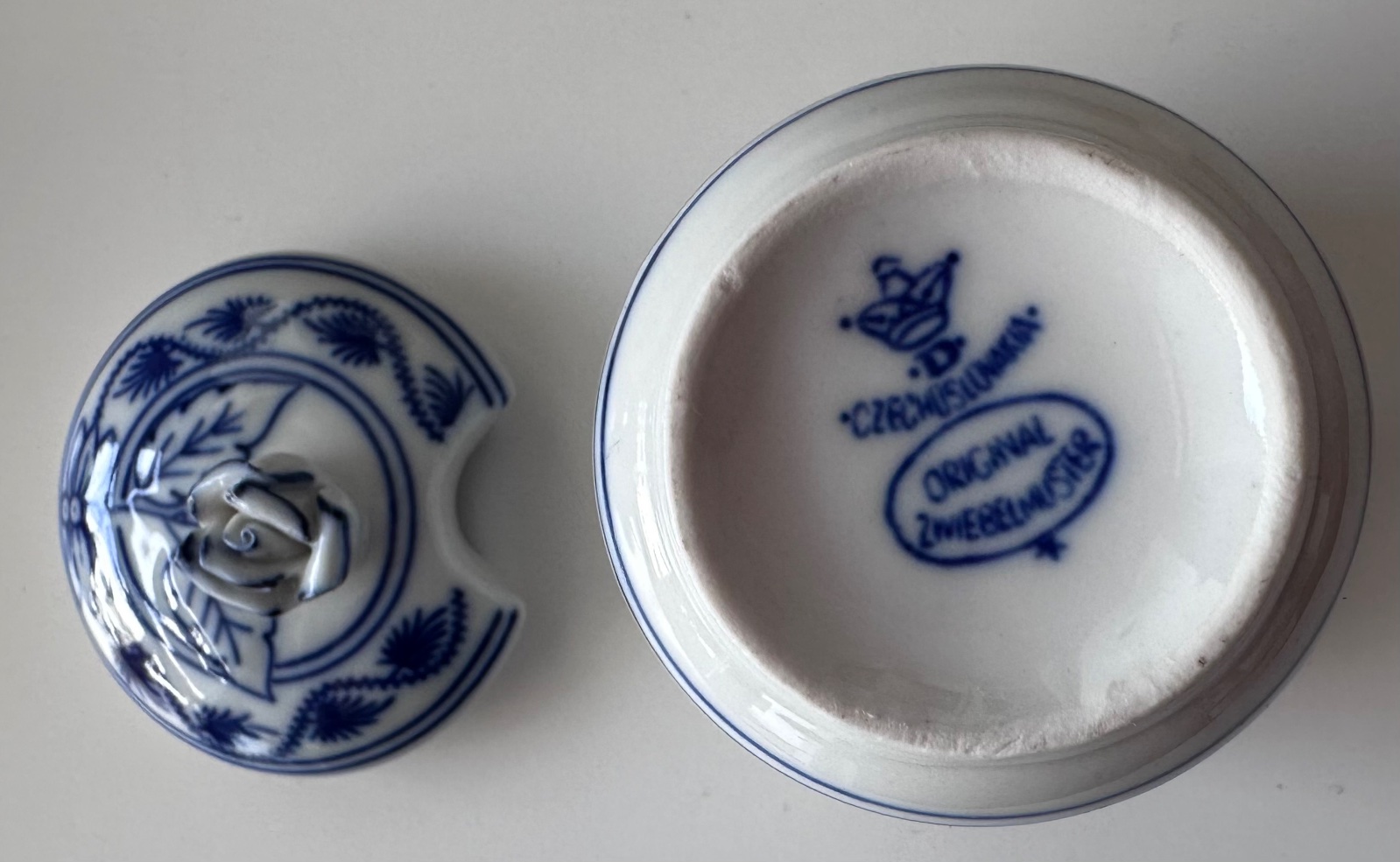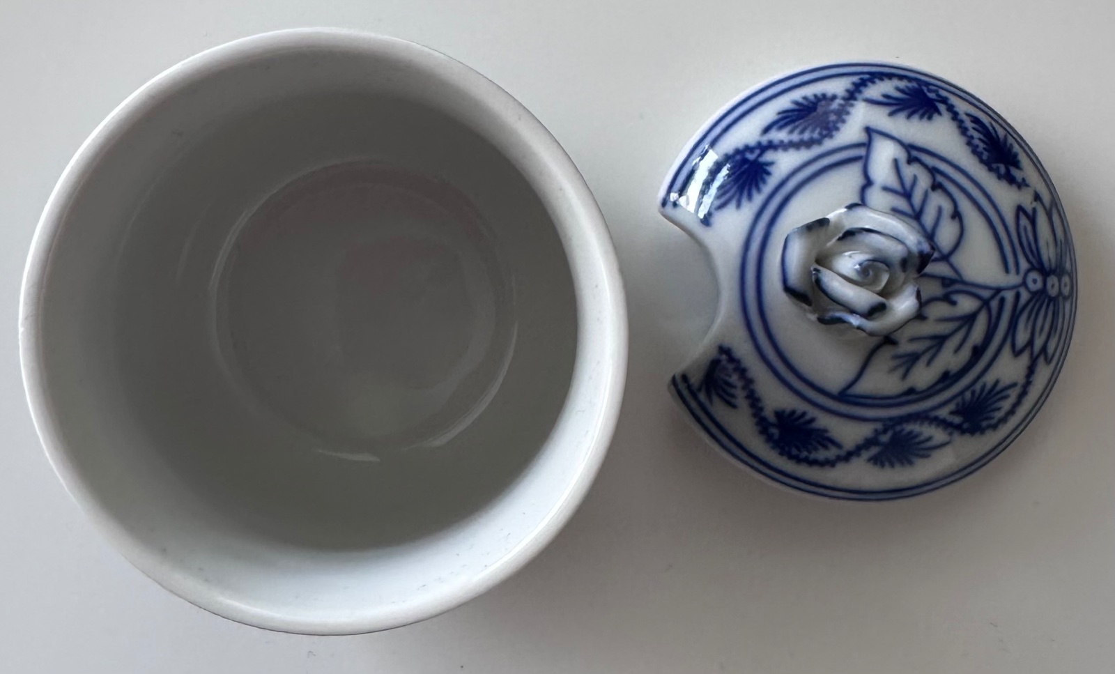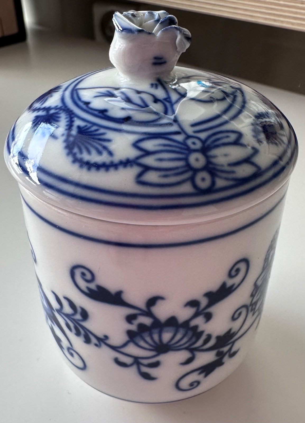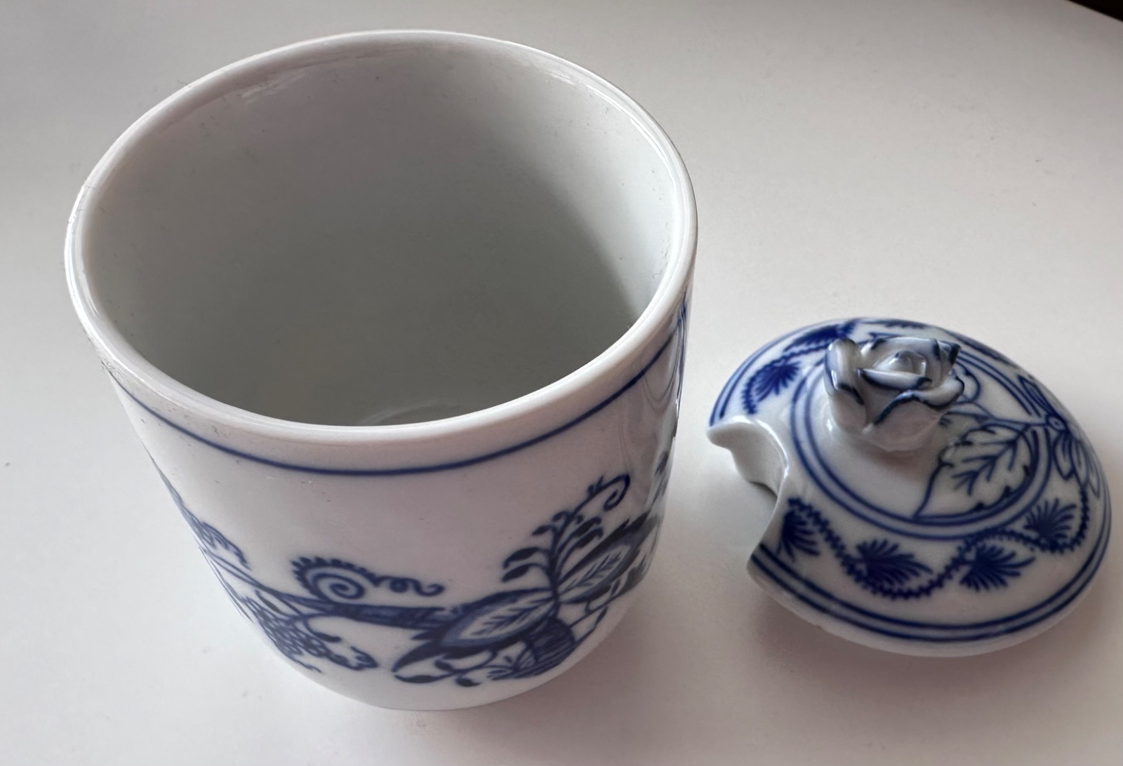 "Budou párečky?" Svou oblíbenou hořčici při kulinářských hodech servírujeme v extra zdobeném hrnku s výřezem pro lžičku (hořčičník) a s víčkem, který má úchytku ve tvaru modelované růžičky. Set, vyrobený z 3 x vypalovaného porcelánu je výrobkem české porcelánky v Dubí u Teplic, firmy s dlouhou tradicí. Kultura stolování je zachována a my si opravdu pochutnáme! Tento originální cibulákový porcelán můžeme mýt v myčce na nádobí.