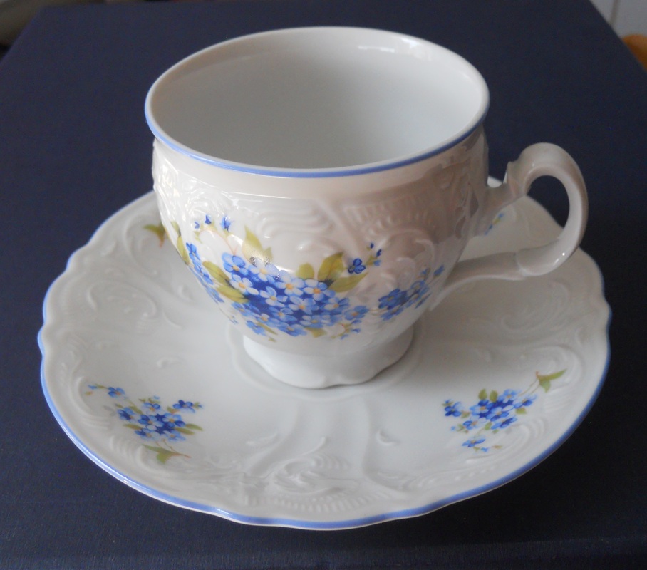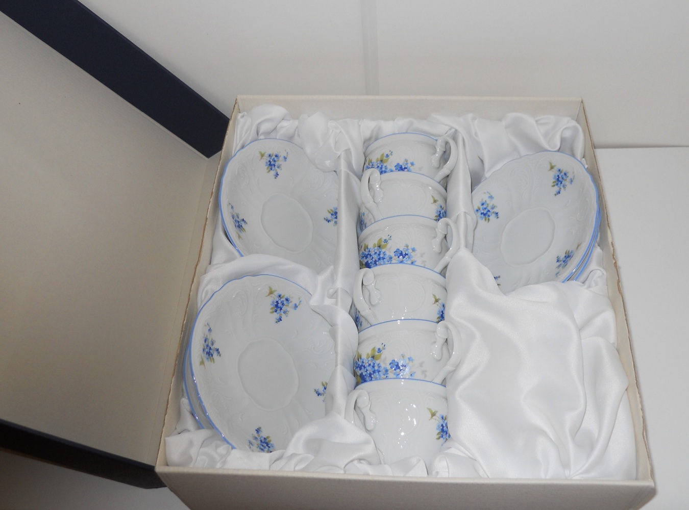 Prodám krásnou nepoužitou 12 dílnou porcelánovou soupravu šesti porcelánových šálků s šesti podšálky. Reliéfně zdobený porcelán s romantickým motivem pomněnek.