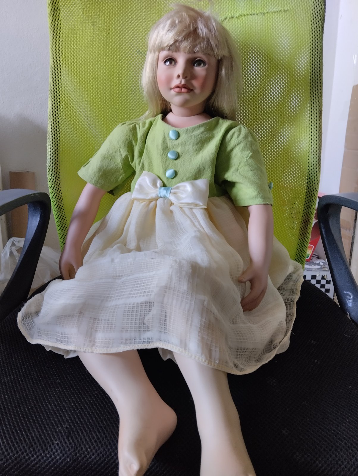Obmněňuji svoji sbírku tak tuto starší mohutnou sedící značenou porcelánovou panenku prodávám.Velikost do sedu je 47 cm celková délka je 85 cm.Šaty má na pár místech poškozené viz foto jinak je v pořádku má nadherný obličej.Z nekuřáckého prostředí.Inzeruji i jinde koukněte i na další mé nabídky ušetříte na poštovném samozřejmostí je i možnost vyzvednutí u mě doma.