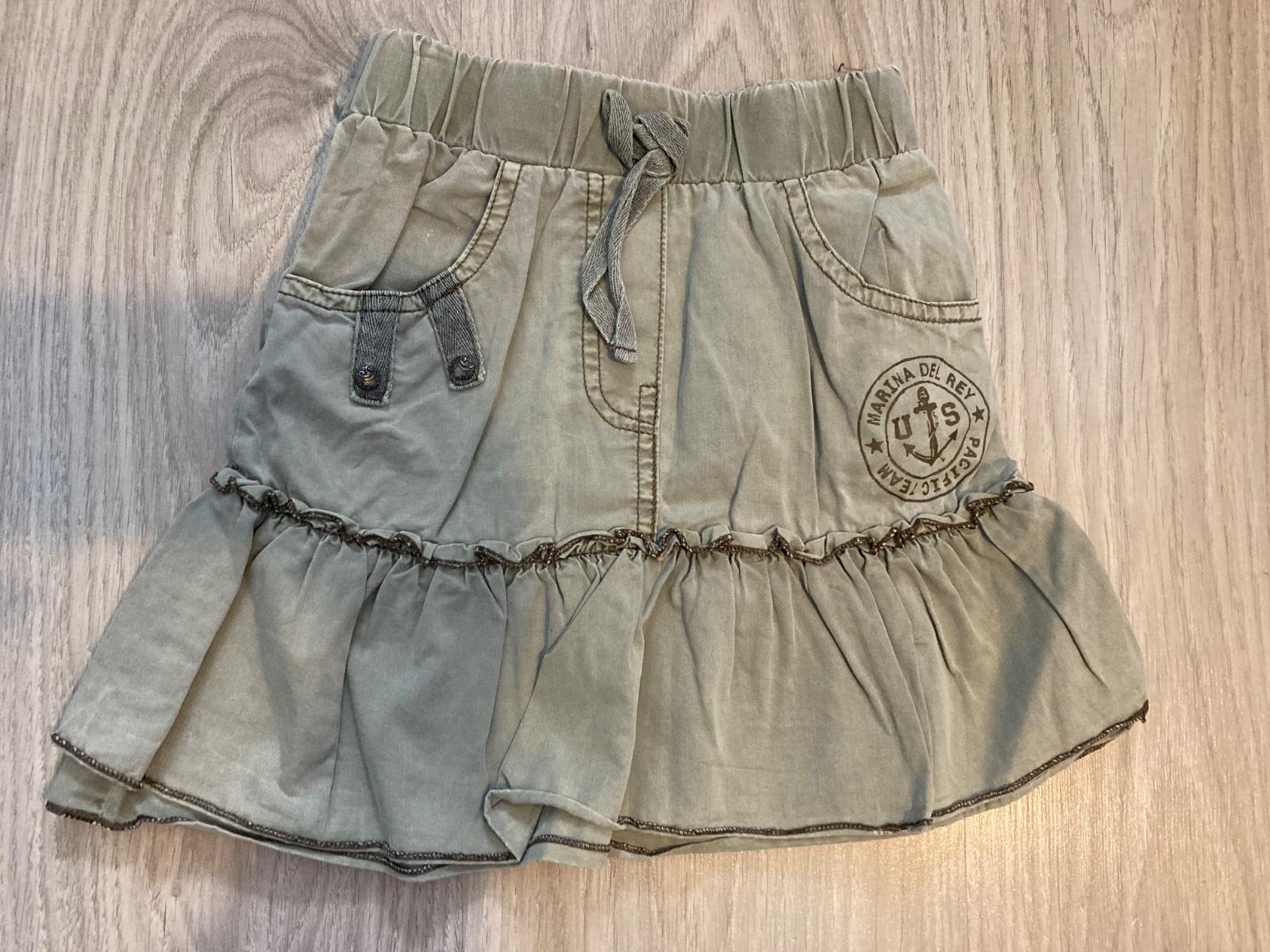 Khaki sukně. 85% bavlna a 15% polyester. V pase na gumu, mašlička jen na parádu. Značku neznám, velikost cca 104/110.