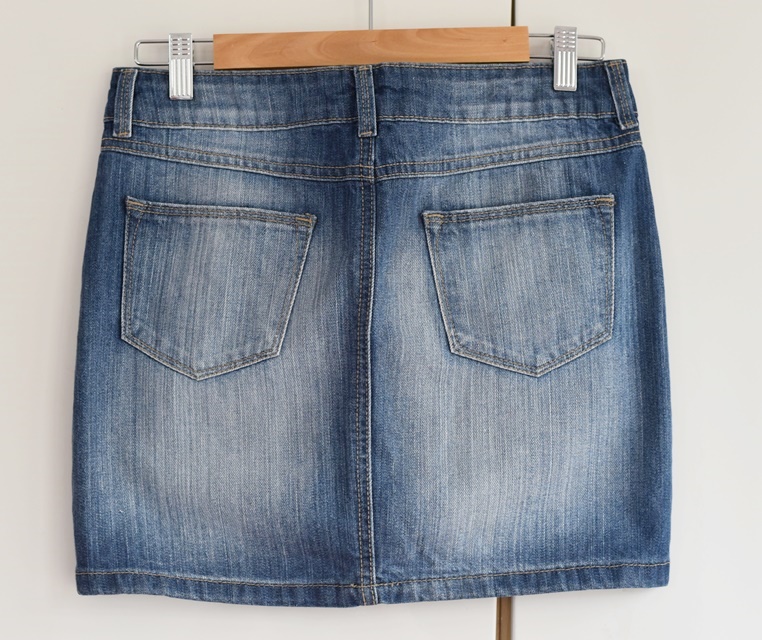 modrá džínová sukně. Džínovina nepruží, pas na pevno.