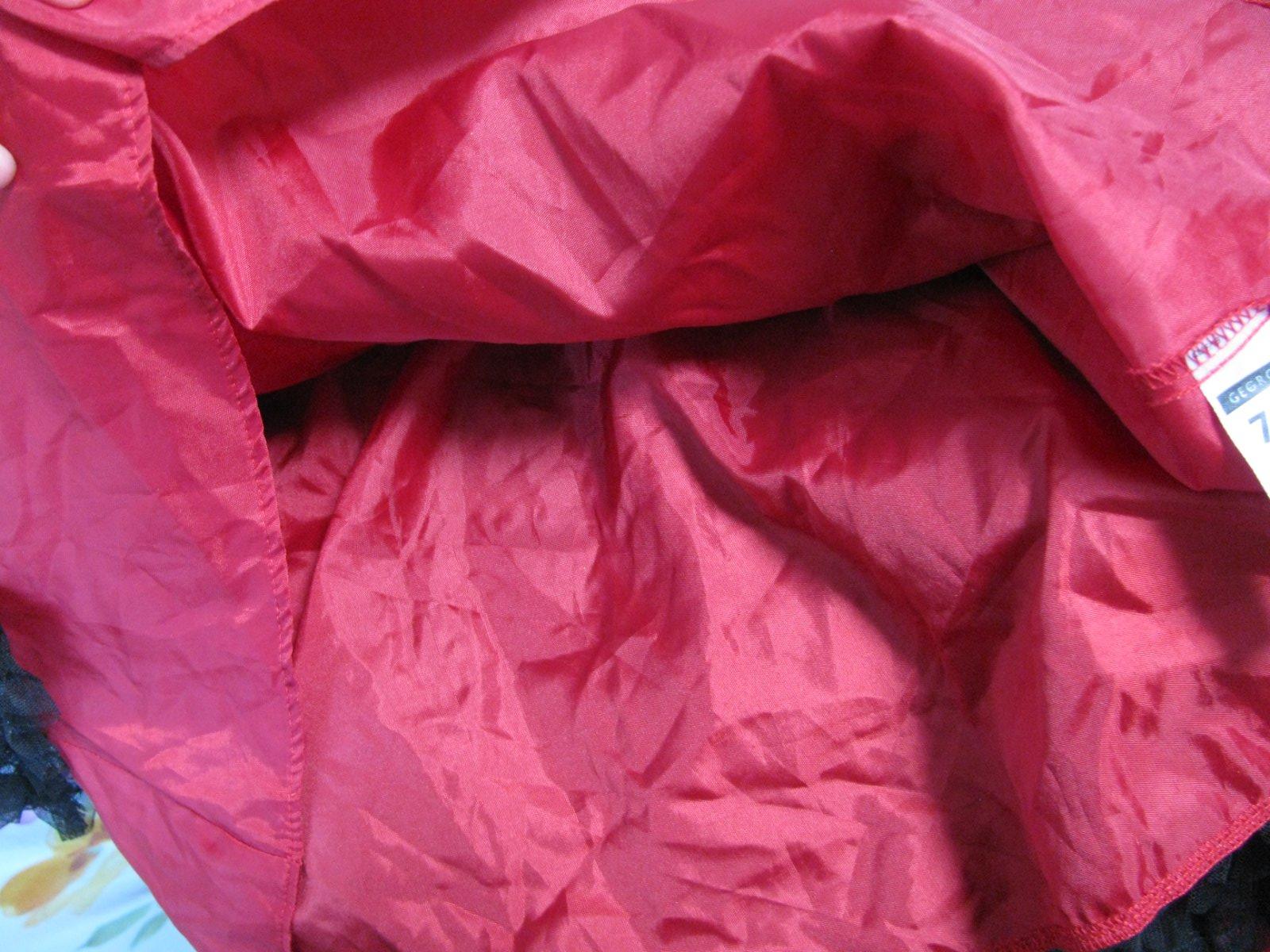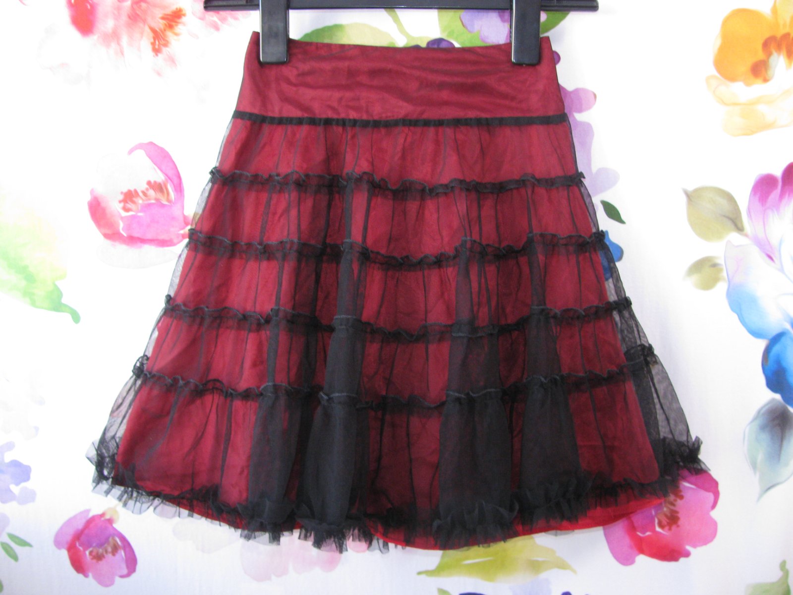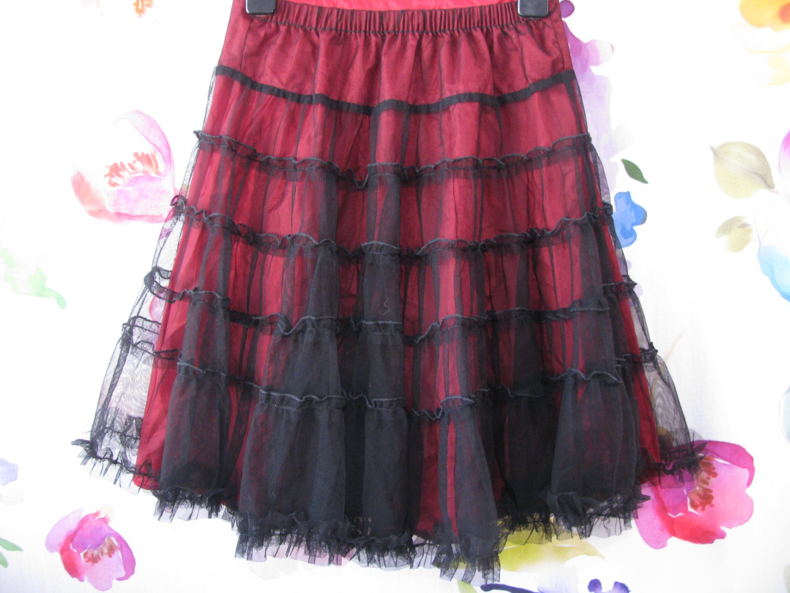 Krásná tylová černá sukně, podšitá vínovou tkaninou, v pase vzadu do gumy, 100% polyester.