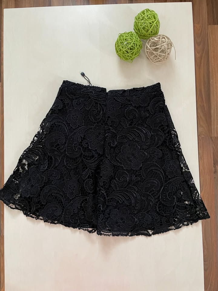 1006. nabízzím k prodeji tuto NOVOU černou krajkovou sukni, el 36/S (myslím klidně i XS), Amisu. Vrchní látka pevná krajka, pod ní spodnička, Pas pevný na zip. Materiál 100%polyester. Nová, zbytek visačky, bez vad, ksráná