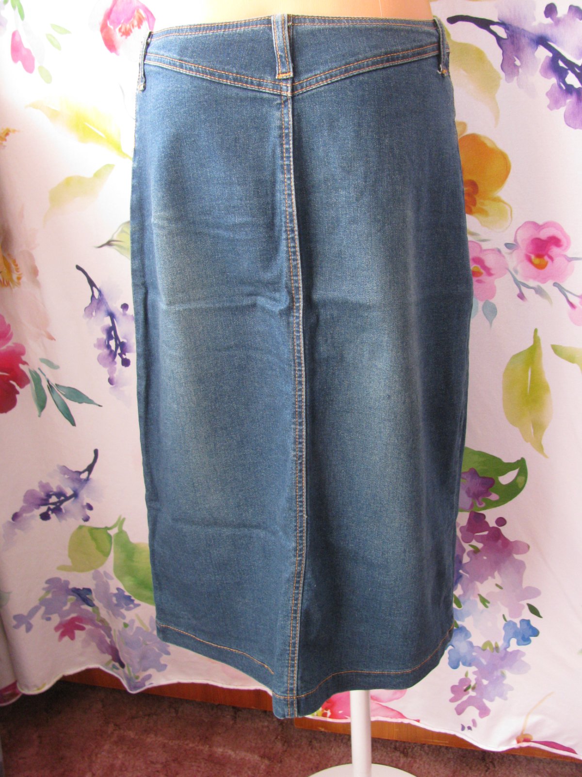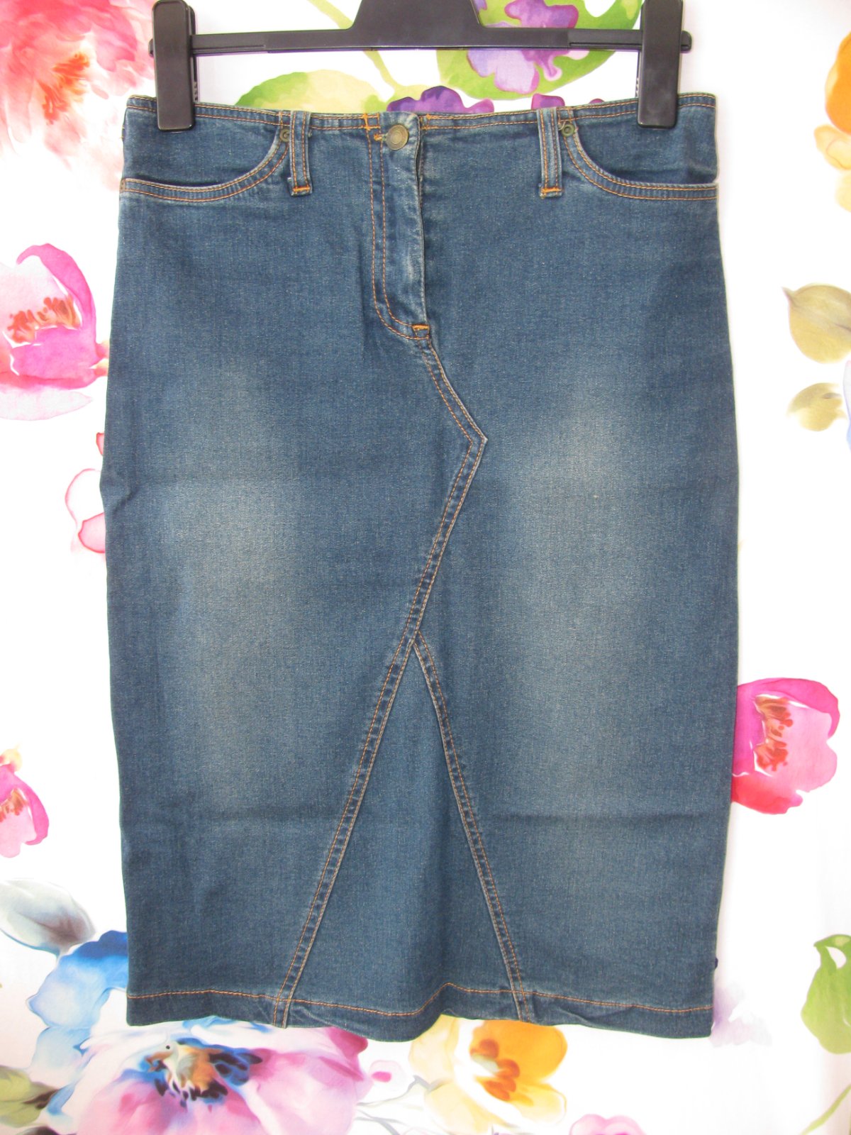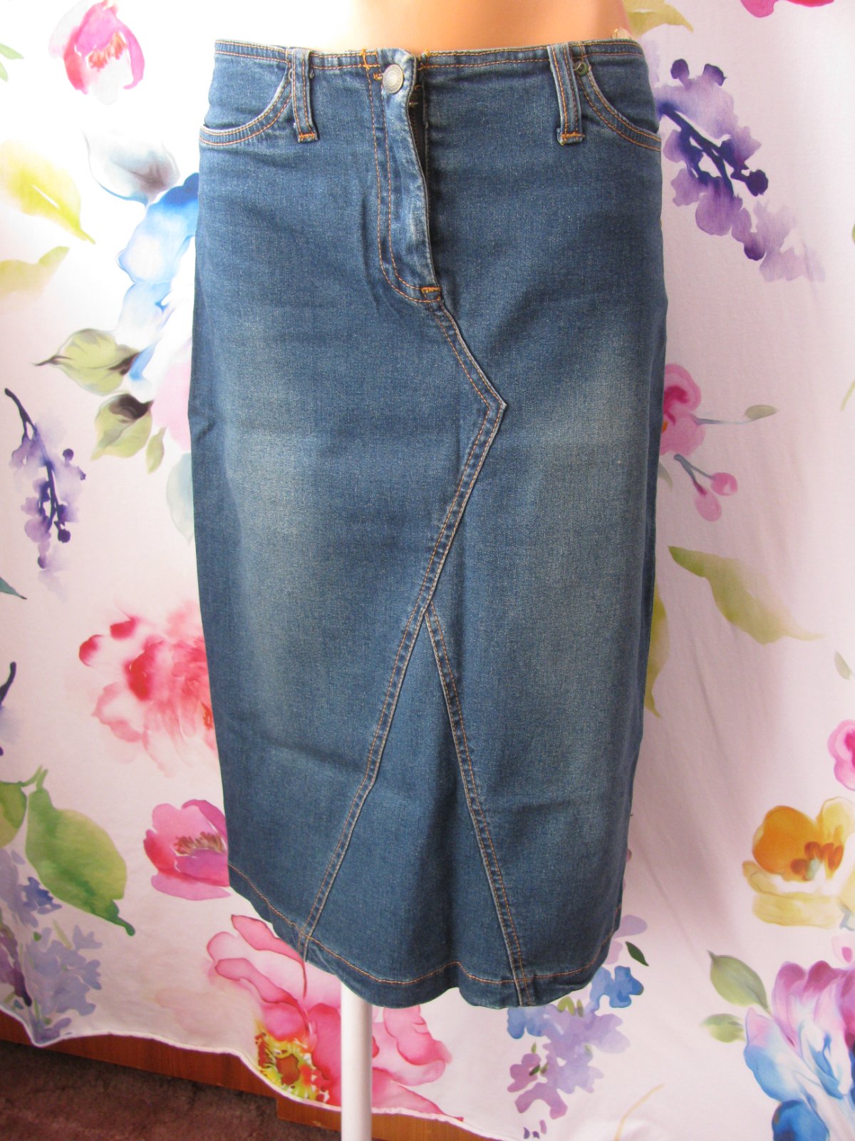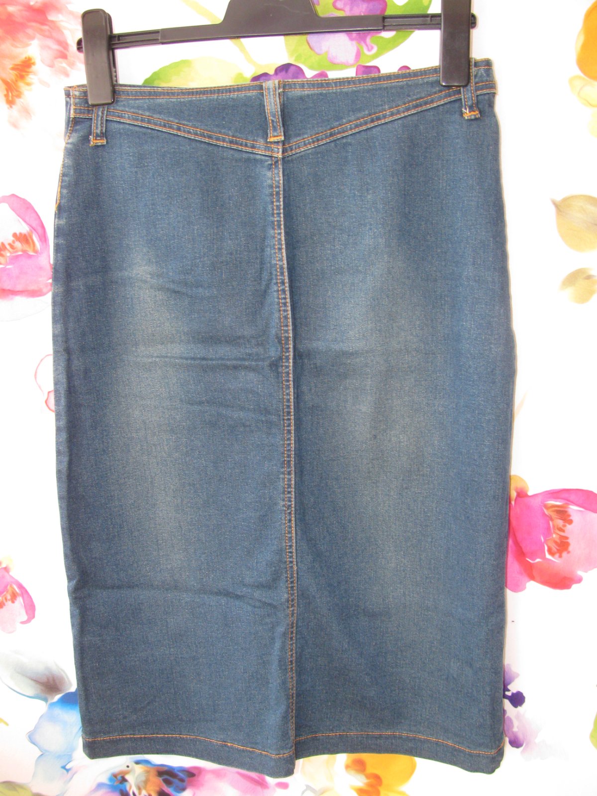 Pružná dámská džínová sukně, zap. na zip a drukový knoflík, přední kapsy, 100% bavlna.