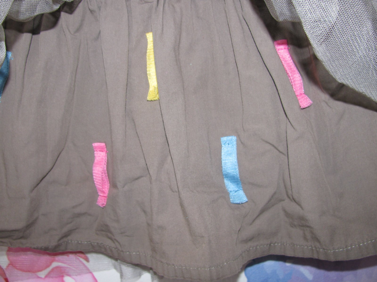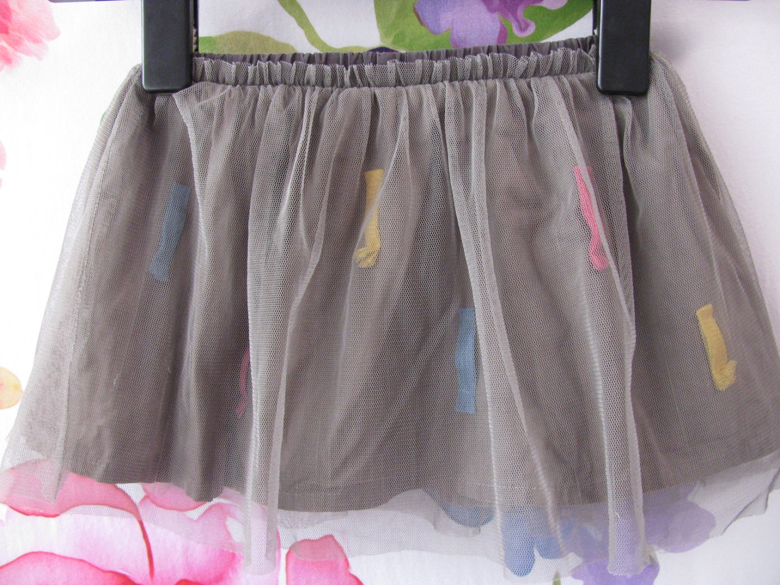 Moc hezká šedá tylová sukně, podšitá plátýnkem s barevnými páskami, v pase pružná guma. 100% polyester, 100% bavlna. Top stav bez vady, přijde mi nenošená.