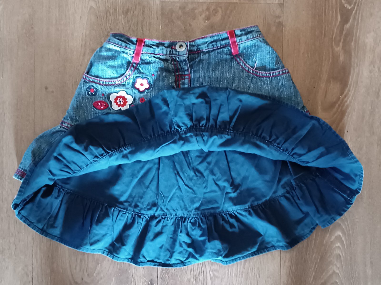 Nabízím riflovou sukýnku s volánky, výšivkou květin a myškou Minnie, v přední části 2 funkční kapsy, vzadu také. Bavlněná tmavěmodrá spodnička, na podzim/zimu i chladnější jaro ideální.