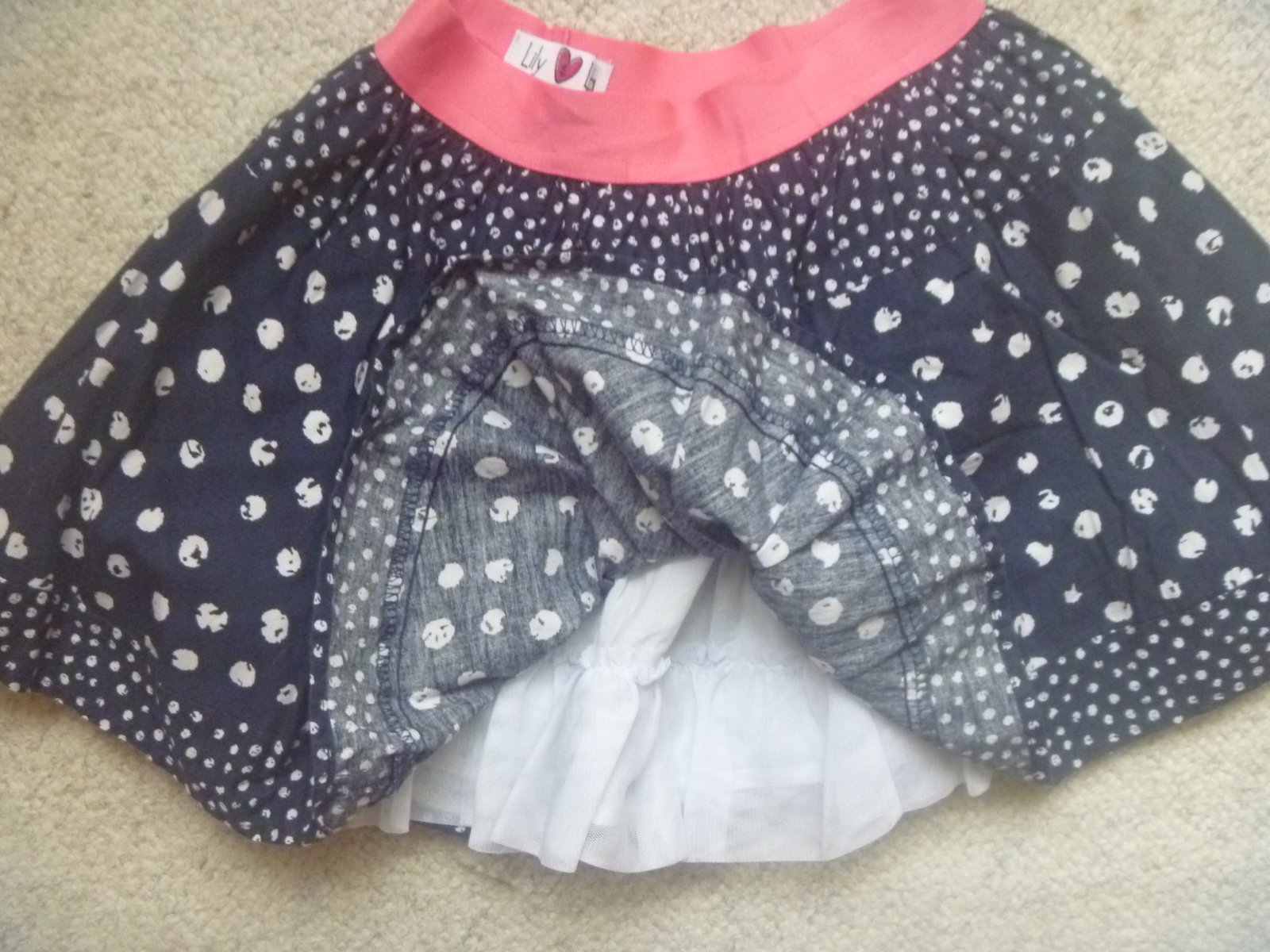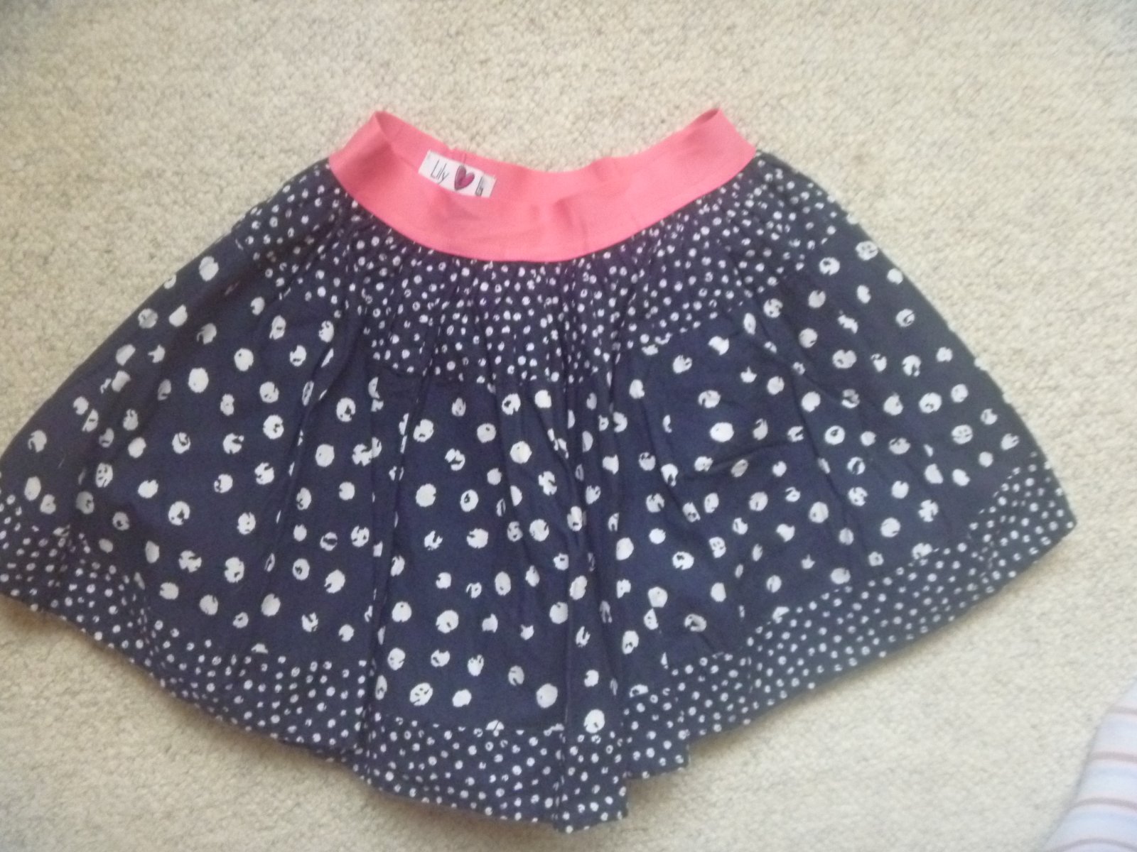 Prodám tmavě modrou puntíkovanou sukýnku, v pase růžová guma, podšitá, značka Lily Lola, velikost 110/116 (5-6 let), materiál 100% bavlna, dobrý stav.