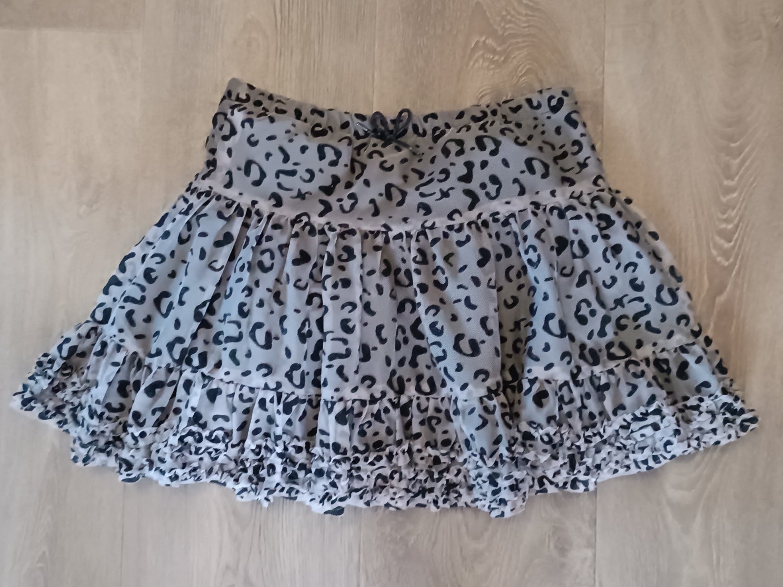 Prodám dívčí šedou tygrovanou sukni H&M, vel.128 (7-8 let), vrchní materiál je šedostříbrný tyl s černými tygrovanými vzory, s nabíranými volánky. V pase je jemná, pohodlná guma, která se příliš nenatahuje. (Šířka v pase max 2x 35 cm). Sukýnka má černou dvojitou spodničku - lesklá, chladivá, 100% polyester. Sukně působí bohatým tutu dojmem.
