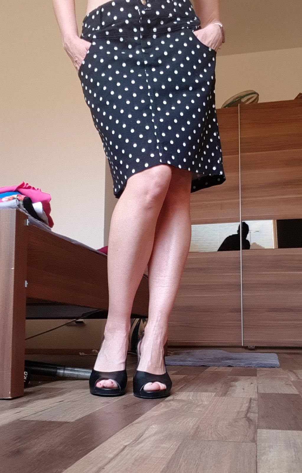 Krásná puntíkatá sukně, pevný materiál, 97% cotton. Vzadu dve kapsy. Vel.38, ale za me možná i 40. Poutka na pásek. Délka 48 cm, šířka v pase cca 42 cm.