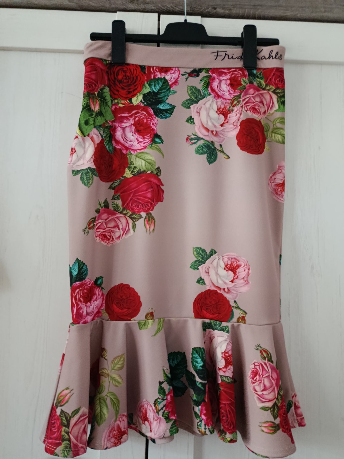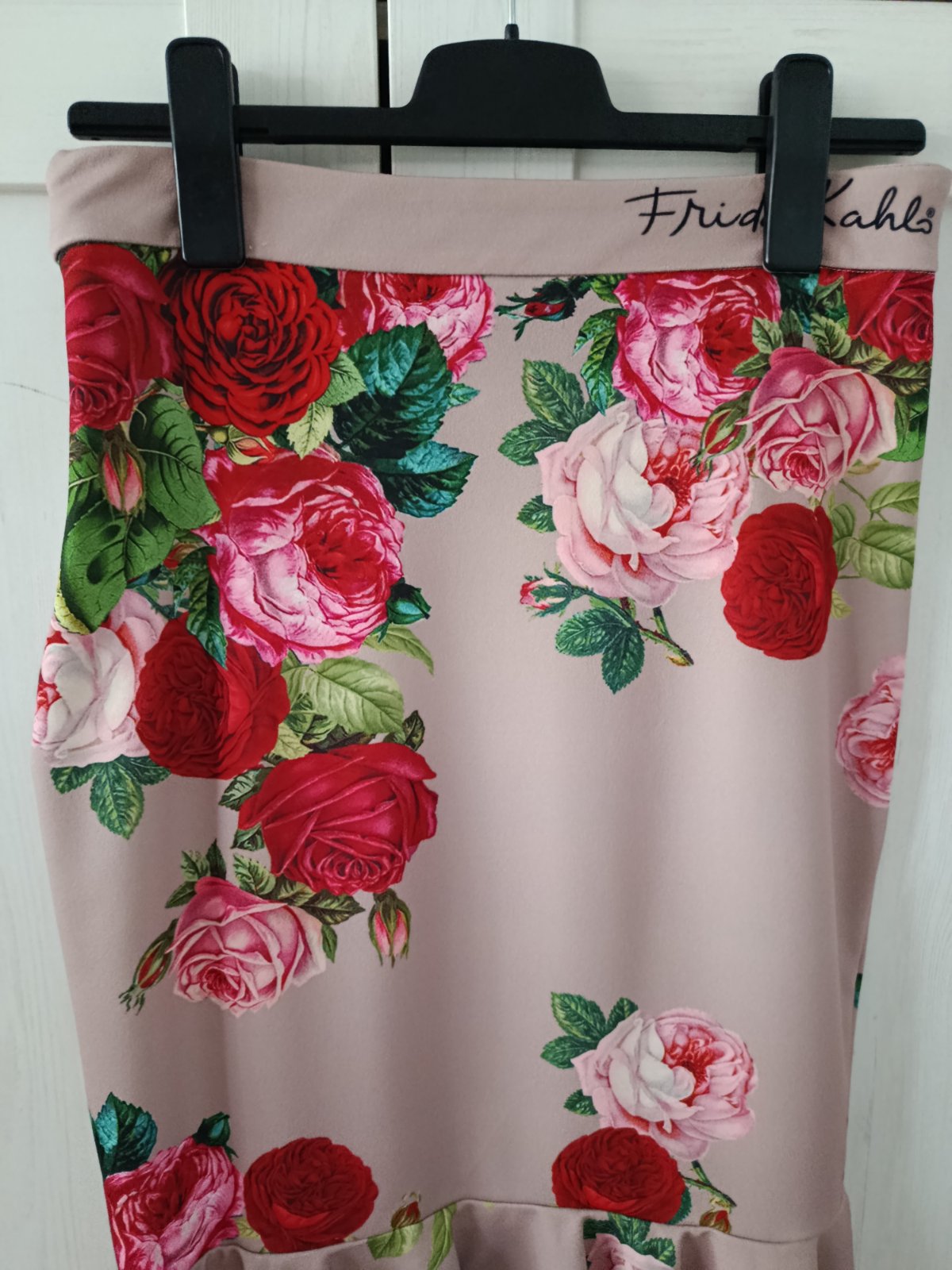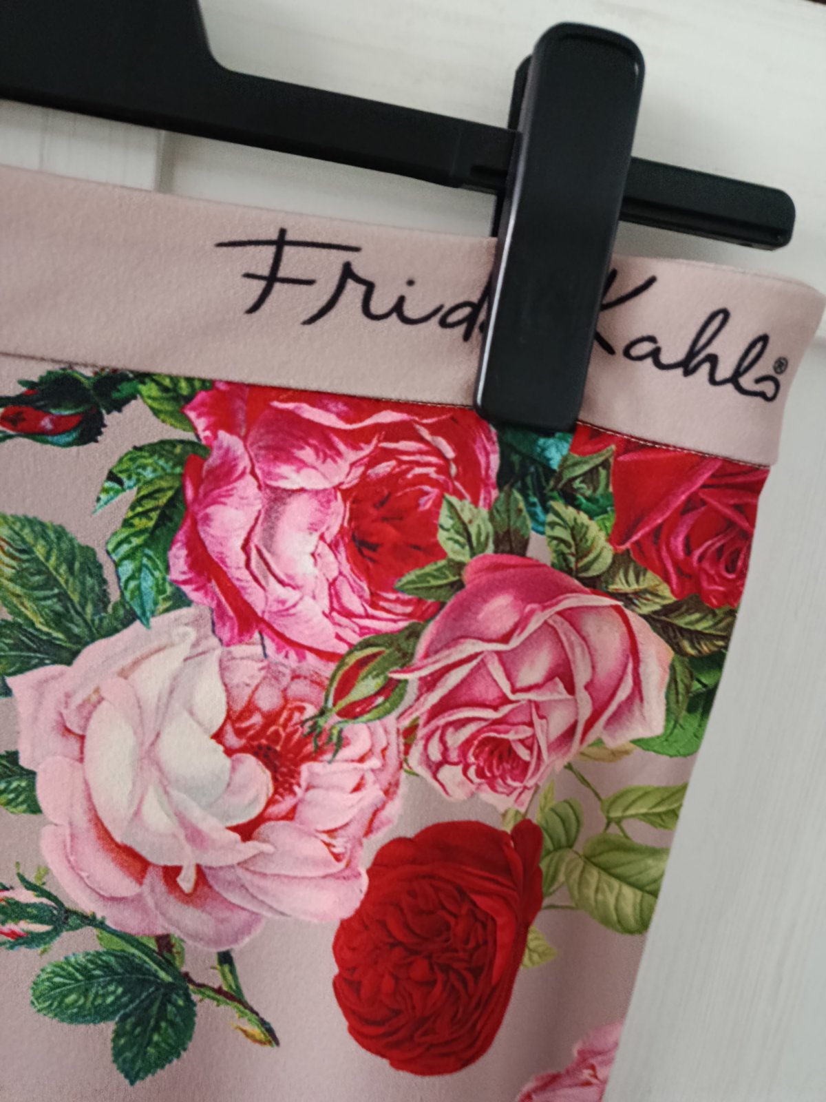 Krásná elastická sukně s potiskem růží a nápisem na pásku Frida Kahlo. Béžový podklad. Na boku zip. Je elastická. Sukně je nová, býval bych potřebovala menší velikost, ale nestihla jsem včas vrátit....Míry : délka 69 cm, pas 2 x 39 cm...Materiál : polyester + elastan. Poštovné - balíkovna za 85 Kč nebo zásilkovnou za 90 Kč.