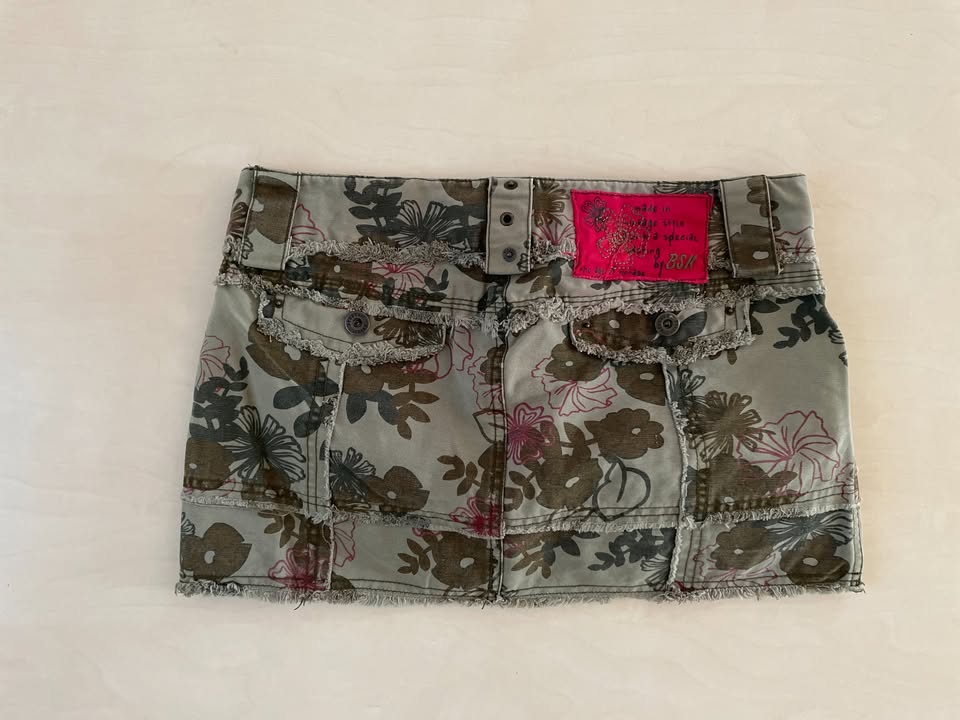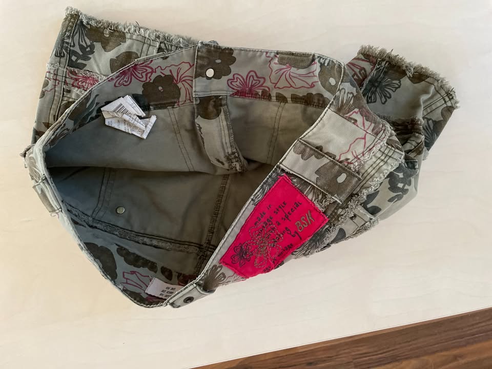 šk8. nabízím k prodeji tuto khaki džínovou minisukni, vel 38/tedy M, spíše menší M až S - nošená při S/M, BSK Cotton. Různé odstíny khaki, potisk květin, třepení, pásky s cvoky. Materiál % bavlna. Nošená, bez vad, krásná