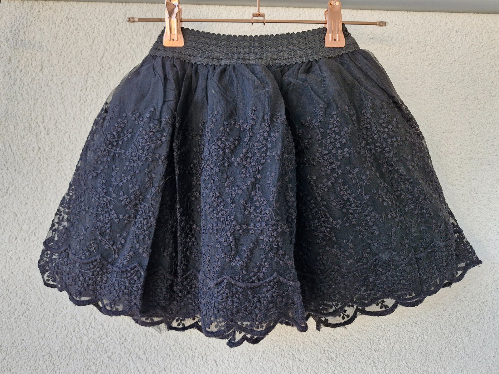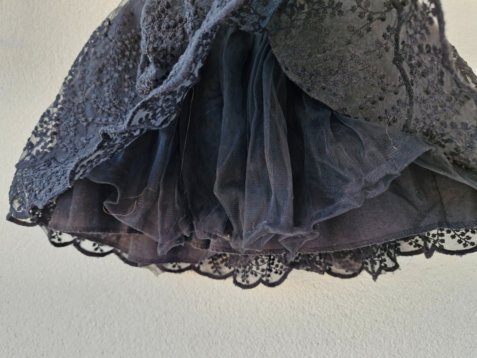 Sukně z několika vrstev a s bavlněnou spodničkou v černé barvě. Nošena příležitostně, takže stále v hezkém stavu bez vad a fleků. V pase na gumu 23,5 cm. Vhodná cca od velikosti 110 cm.