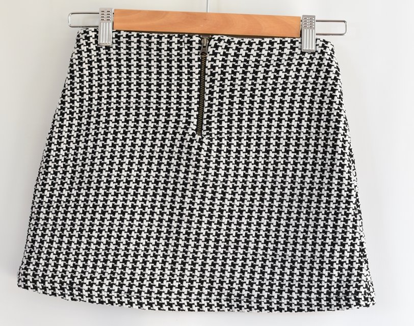 Černo bílá úpletová sukně. Pružná, zip. Regulace v pase není.