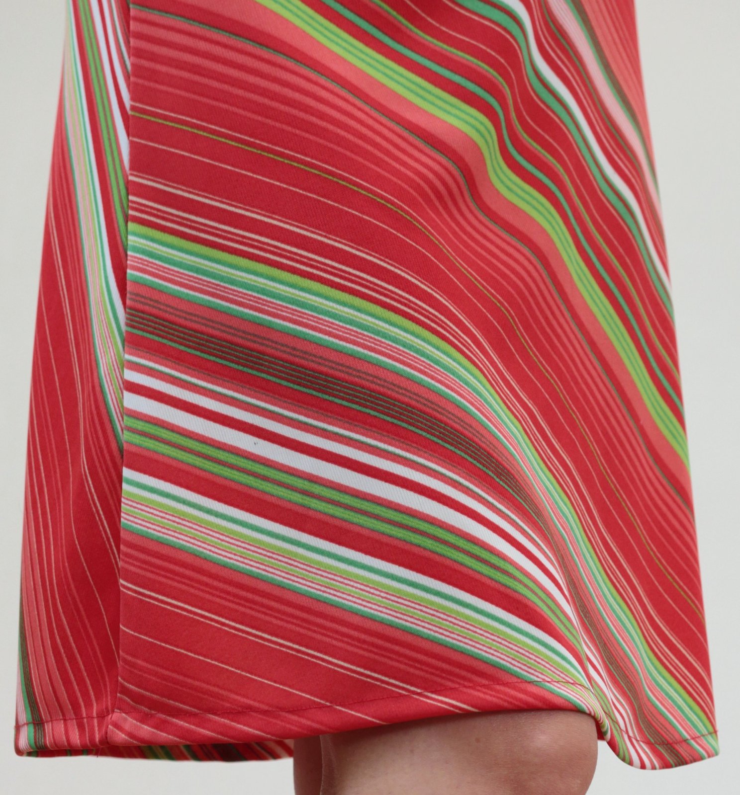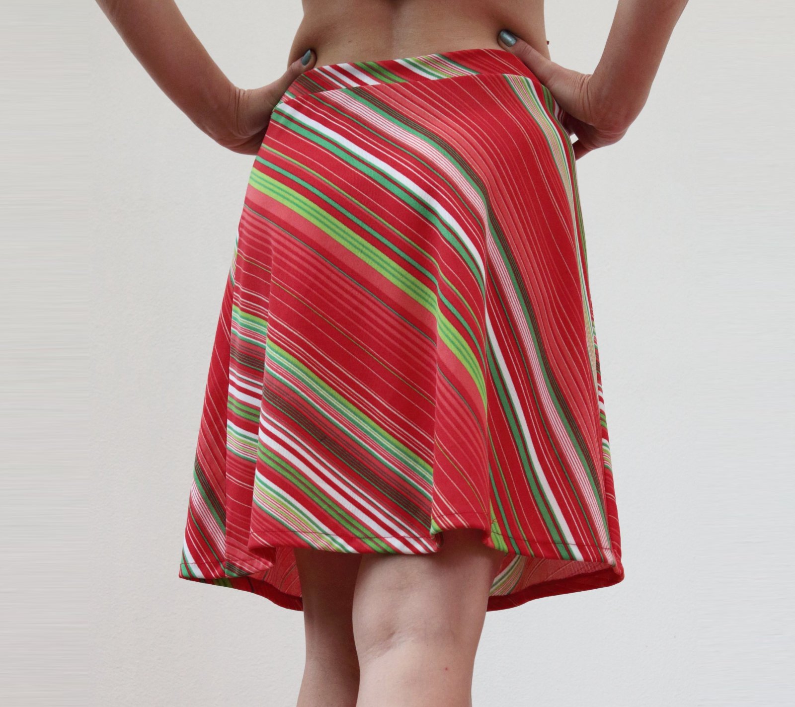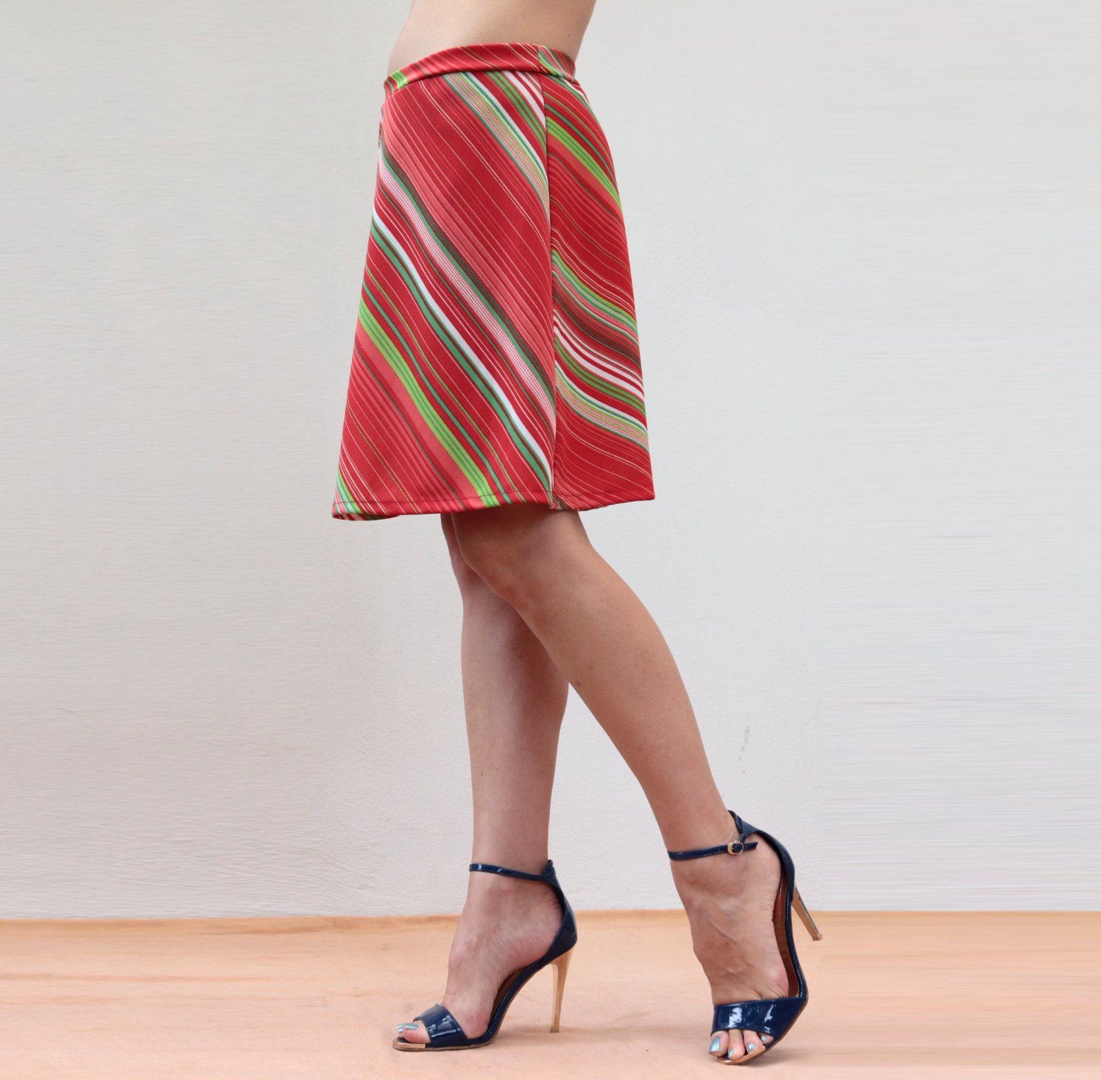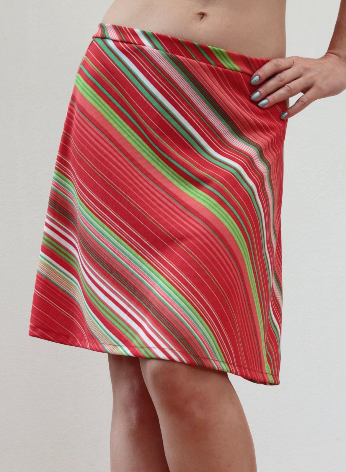Pružná sukně ke kolenům, áčkového střihu, natahuje se přes pružný pas, nemá zip ani gumu. Typický retro vzor - šikmé různě široké pruhy v červené, korálové, bílé a dvou odstínech zelené. Nemá cedulku s materiálem ani velikostí. Bude se jednat o syntetický úplet, asi polyester. Rozměrově odpovídá 36, míry: pas 72 cm, boky ve vzdálenosti 26 cm od pasu 110 cm, délka 48 cm. Sukně je nošená, ale v bezva stavu. Odeslání poštou, Balíkovnou nebo Zásilkovnou, cenu za odeslání napíšu do zprávy.