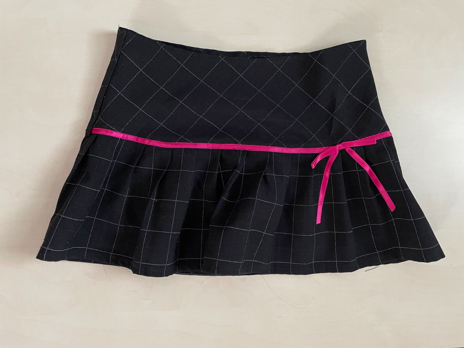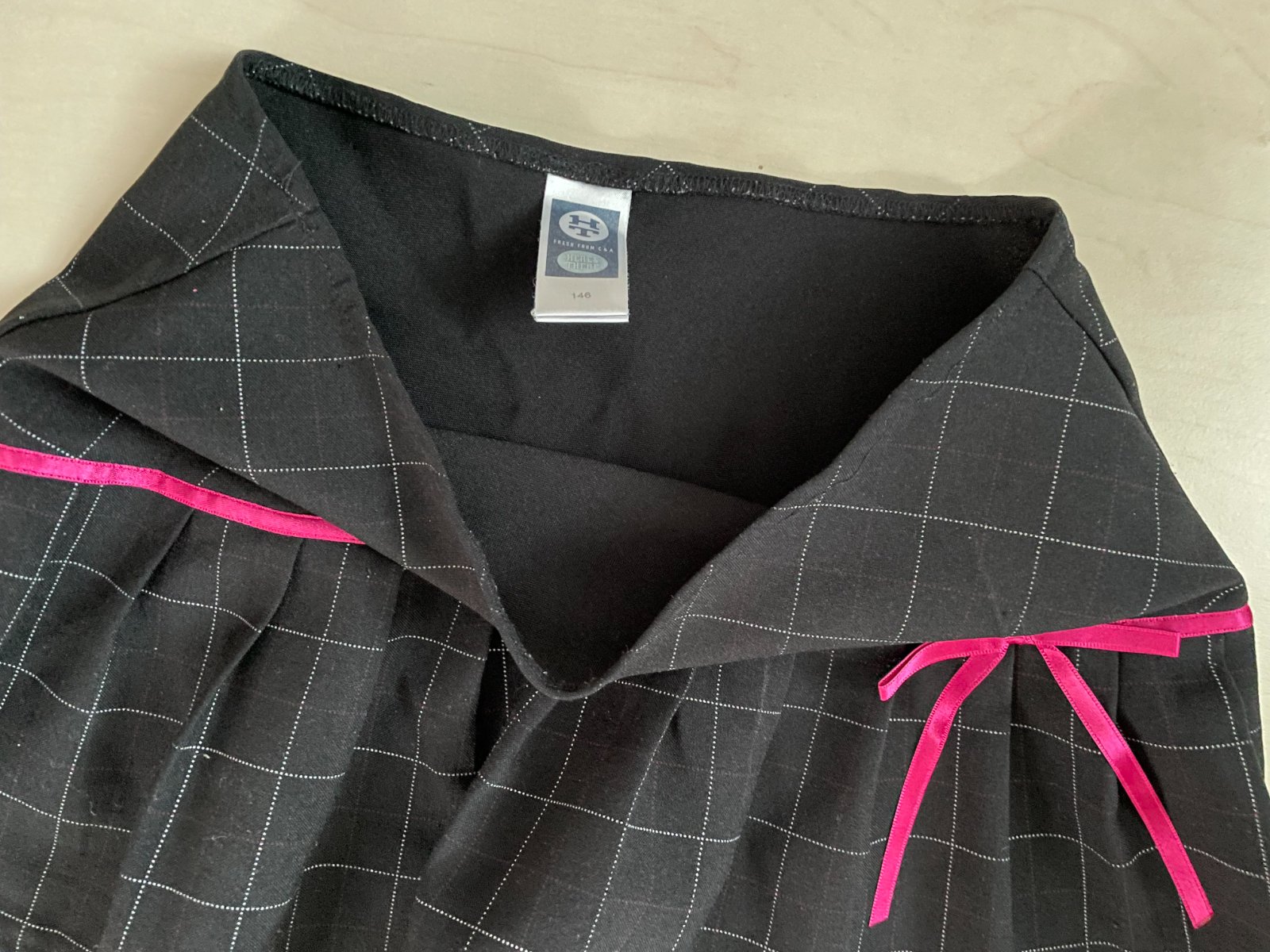 hol nabízím k prodeji tuto černou minisukni s kárem a růžovou mašlí, vel dívčí 146, tedy cca 11 let, asi i více dcera nosila i kolem 14-15 - měřte,je ale krátká , here there. Pas pruží jen lehce, na zip. Mteriál 100% polyetser. Nošená, bez vad, krásná