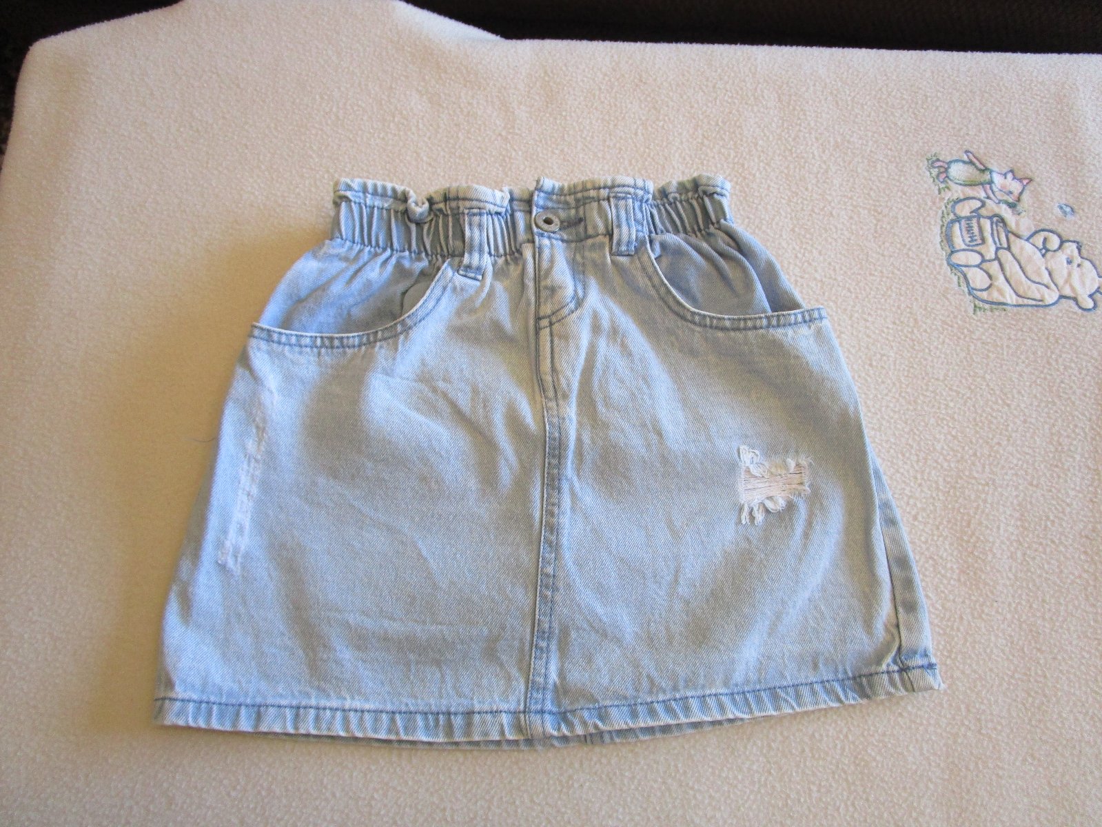 Sv. modrá riflová sukně, v pase pružná guma, vel. 134 (8-9 let), cena jen 49 Kč.