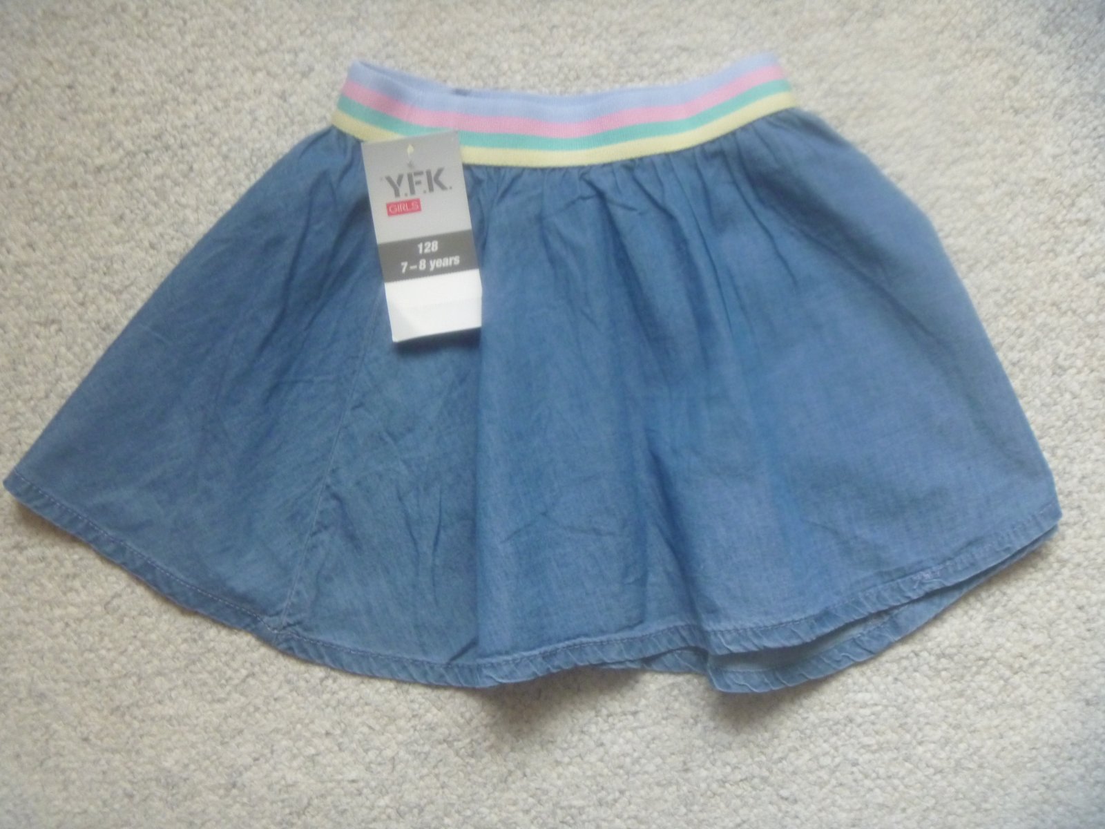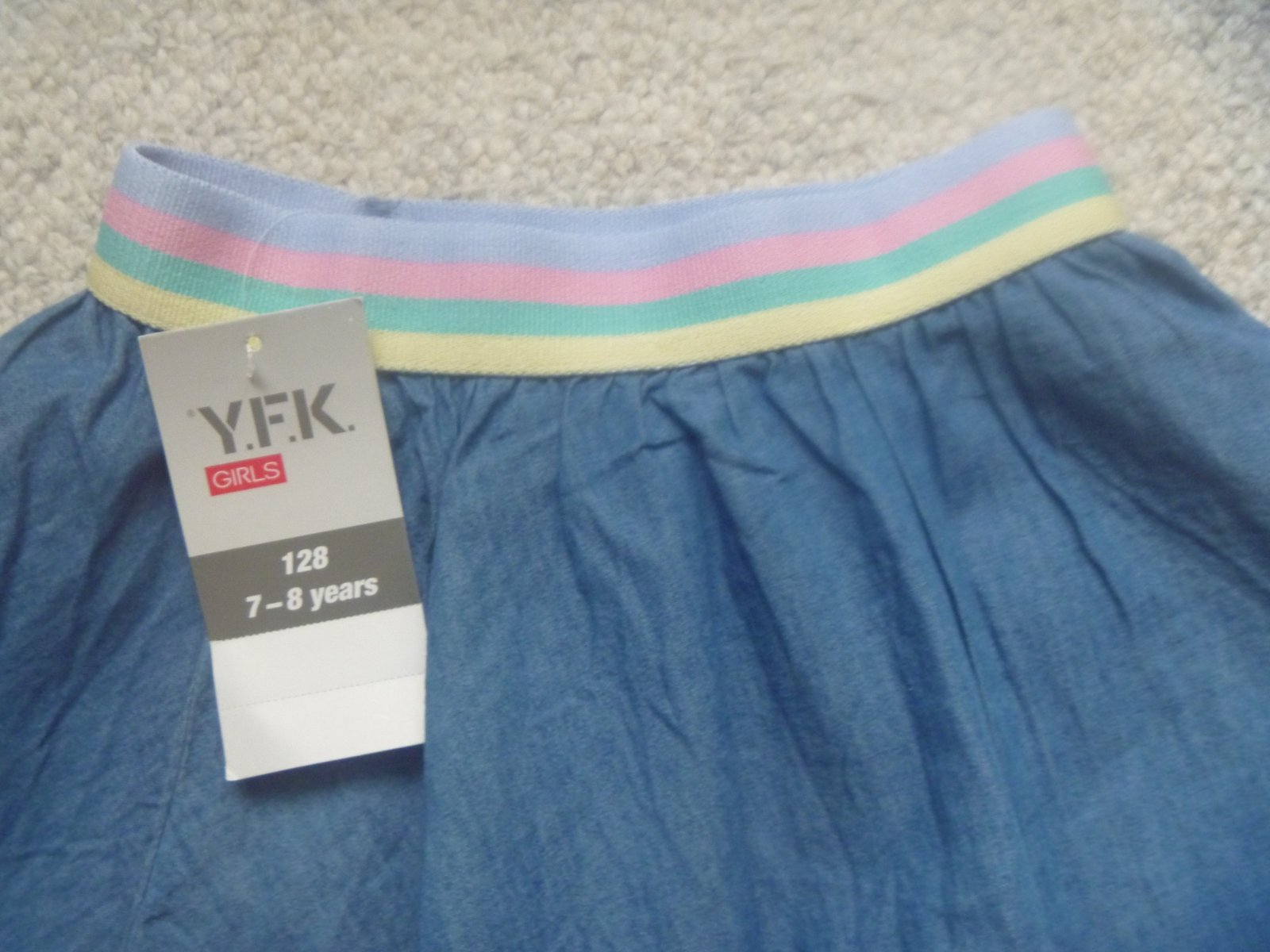 Prodám novou modrou sukýnku s pružným různobarevným pasem, značka Y.F.K., velikost 128 (7-8 let), materiál 93% bavlna, 5% viskóza, 2% elastan, ještě s visačkou, vhodné jako dárek.