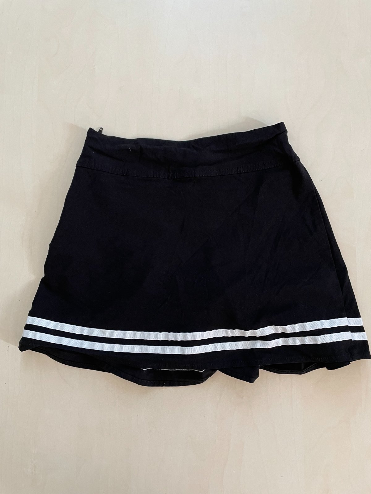 let. nabízím k prodeji tuto černou minisukni se sklady na přední straně a bílým proužkem, vel 32 tedy cca XXS a klidně i pro slečny - měřte, HM, Divided. Zapínání boční zip. Látka lehce pruží. Materiál 67% viscoza, 29% polyamide a 4% elasten. Nošená, bez vad, krásná