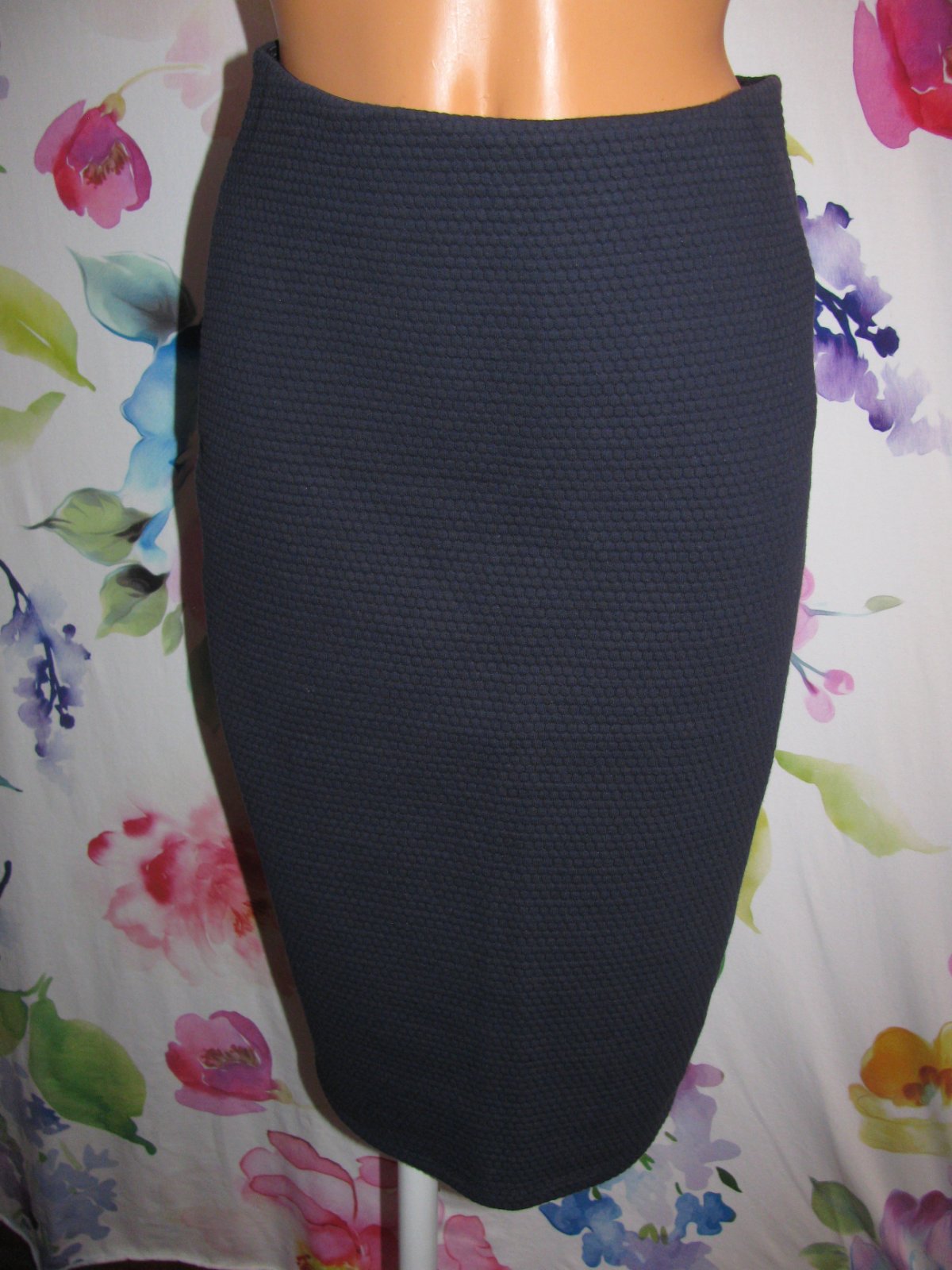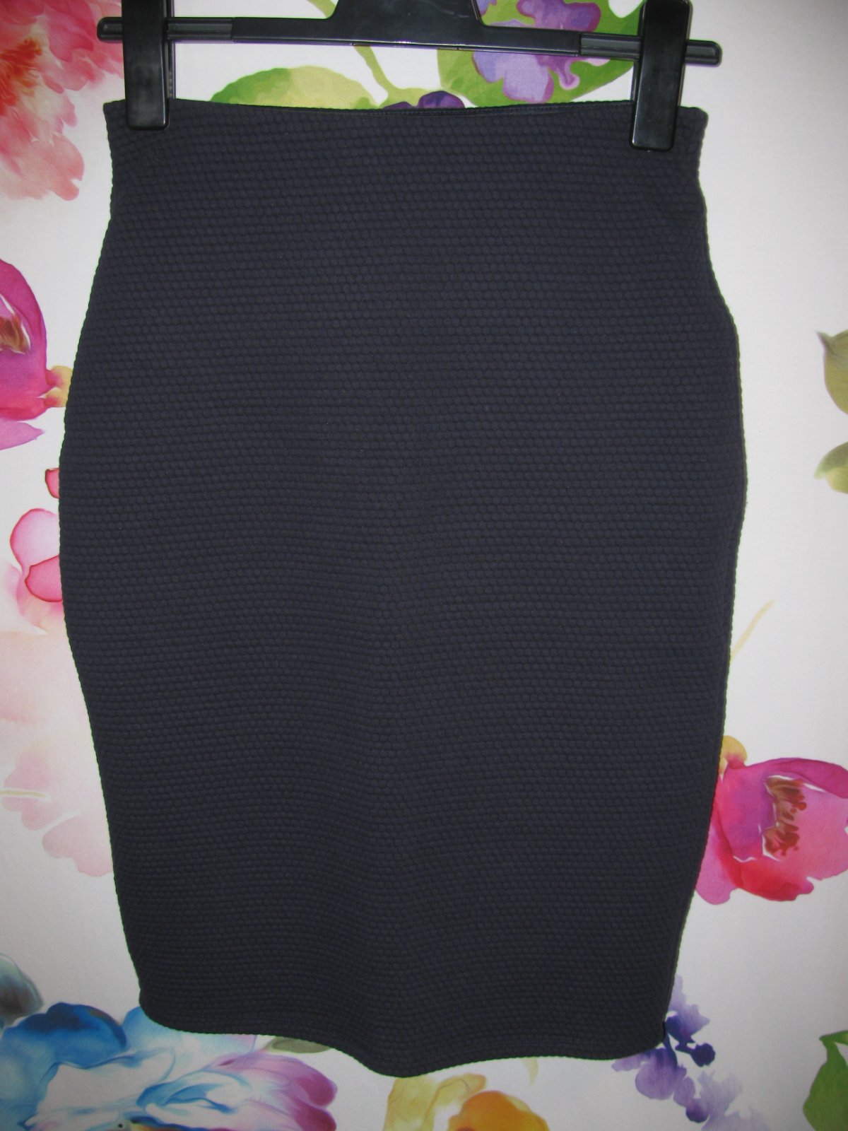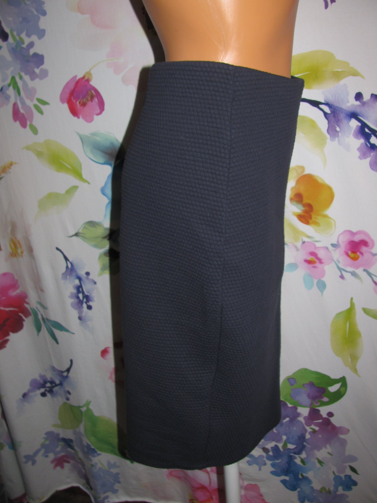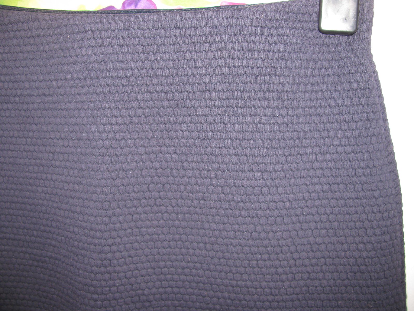 Hezká, tmavě modrá sukně s texturovaným vzorem, v pase širší pohodlná guma, 59% polyester, 39% bavlna, 2% elastan. Na rubové straně sukně něco žmolík, jinak bez vady, hezký stav.