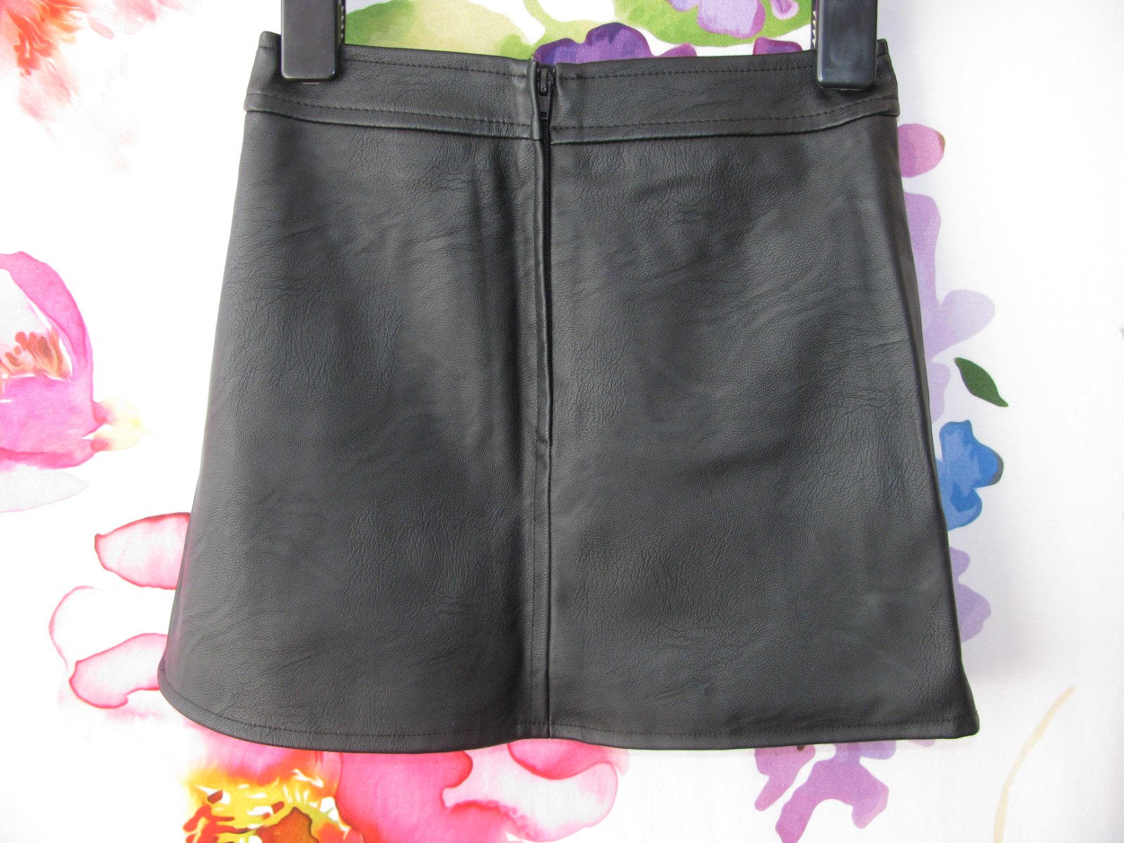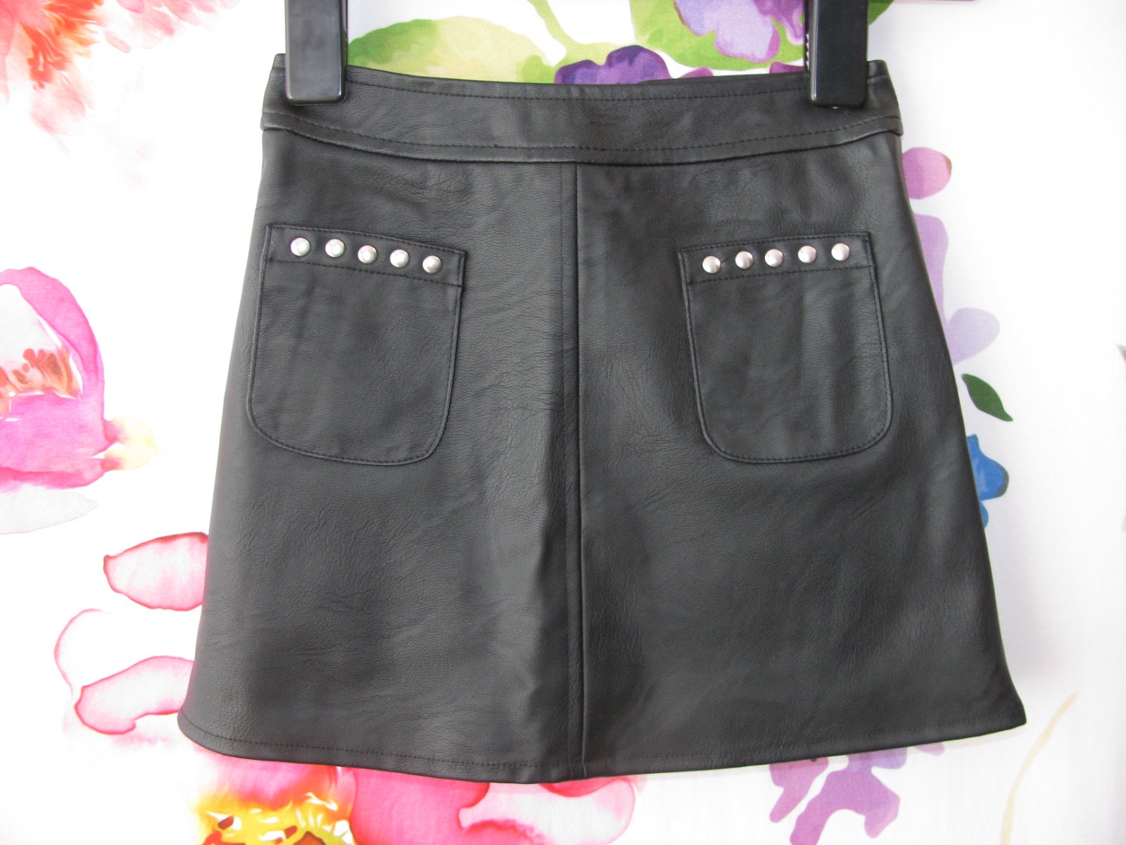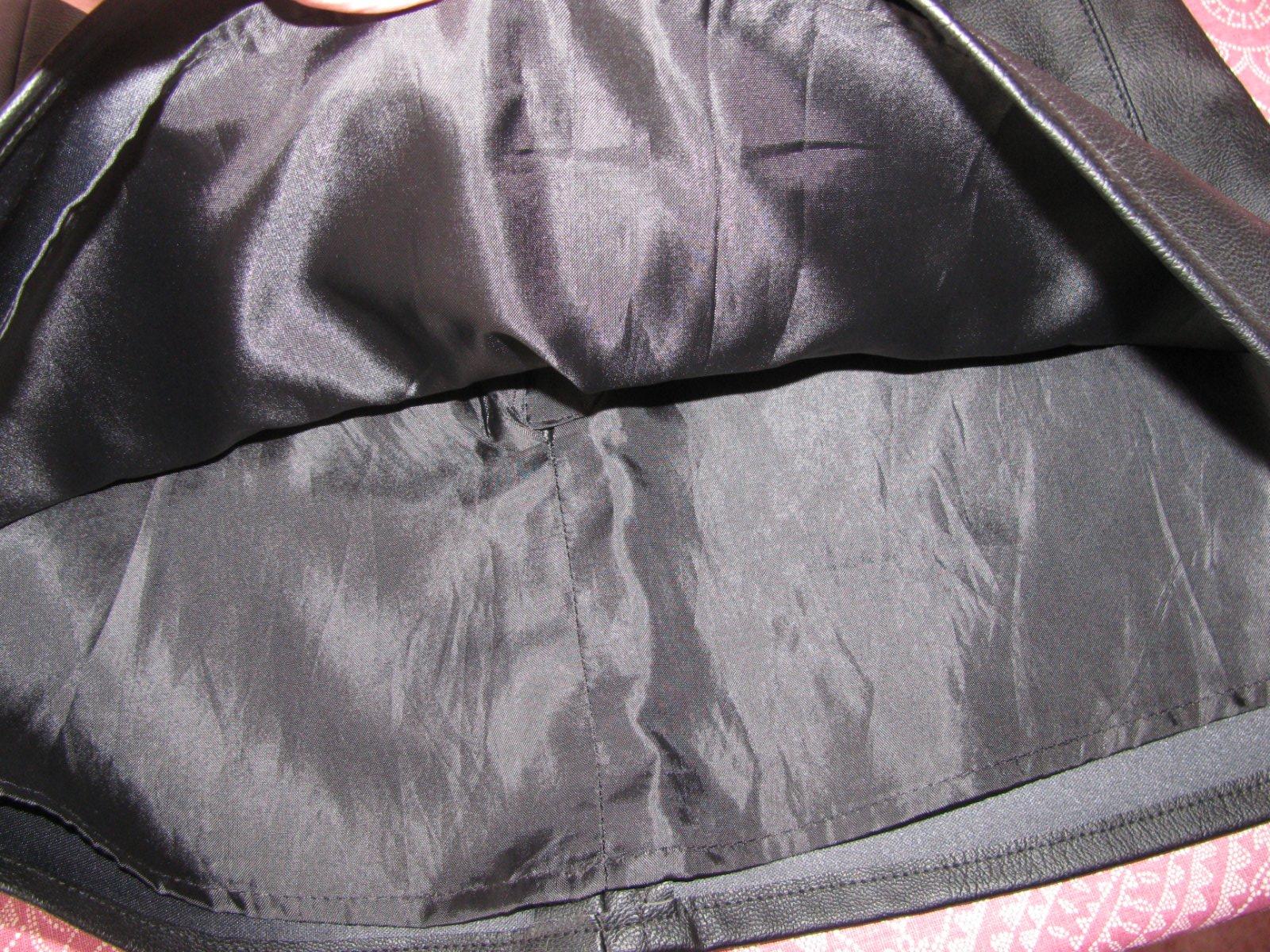 Sytě černá sukně, z umělé kůže, s všitou spodničkou ,vzadu na zip, kapsy zdobené cvočkami, 100% polyuretan. Není popraskaná, kůže se neloupe.