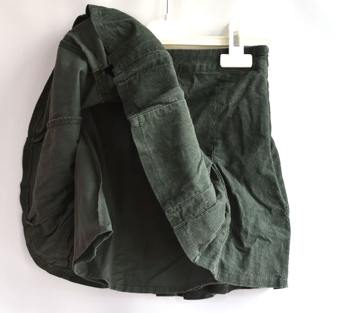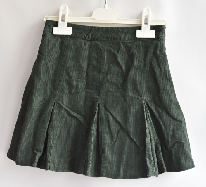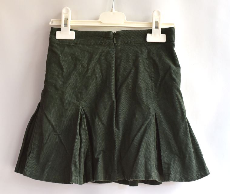 Tm. zelená manšestrová sukně. V pase regulace, na boku zip. Má spodničku.