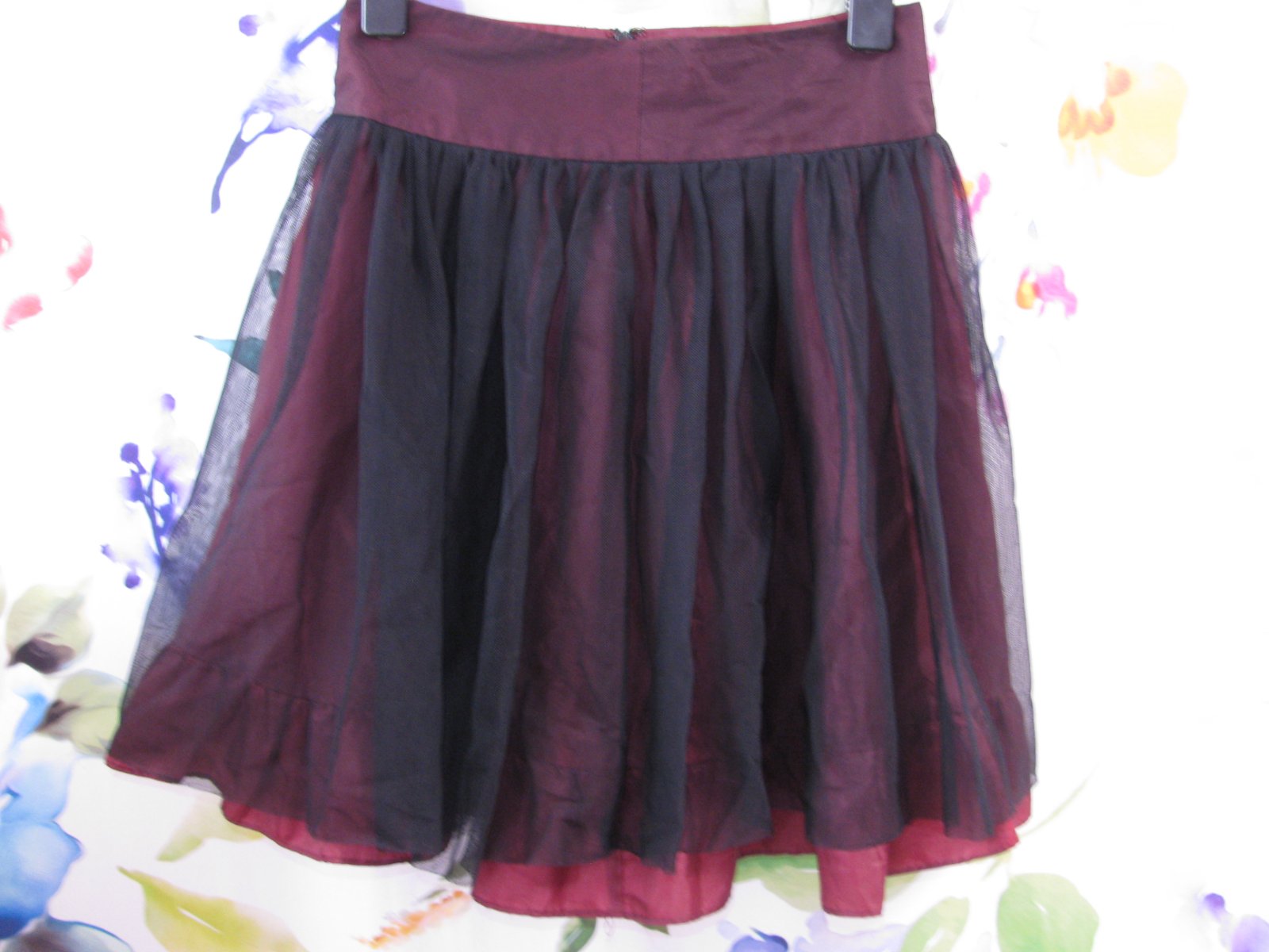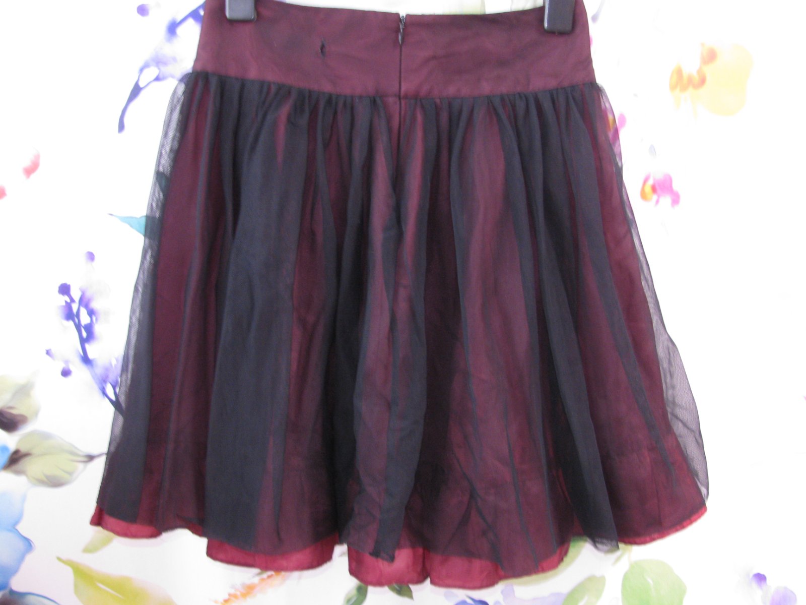 Krásná dívčí sukně, černý tyl, vespod vínová šusťákovina, vzadu zip, v pase není pružná. 100% nylon, 100% polyester. Top stav bez vady. Sukně se hodí na společenské události.