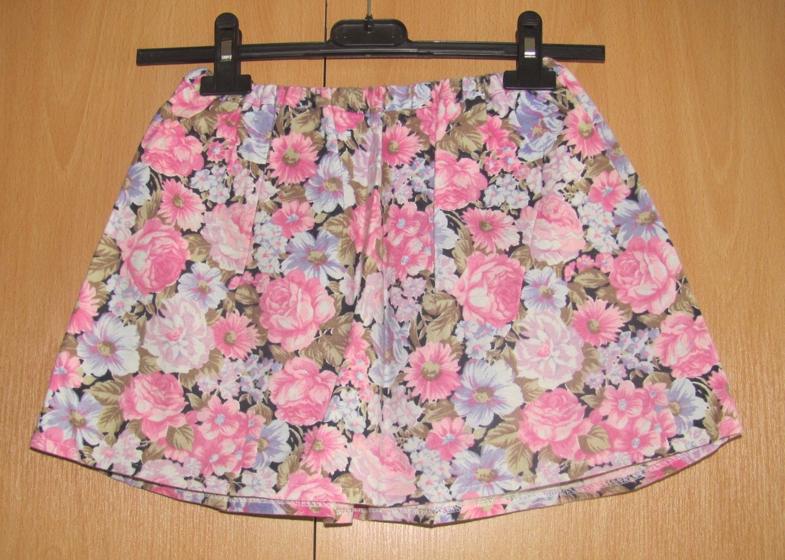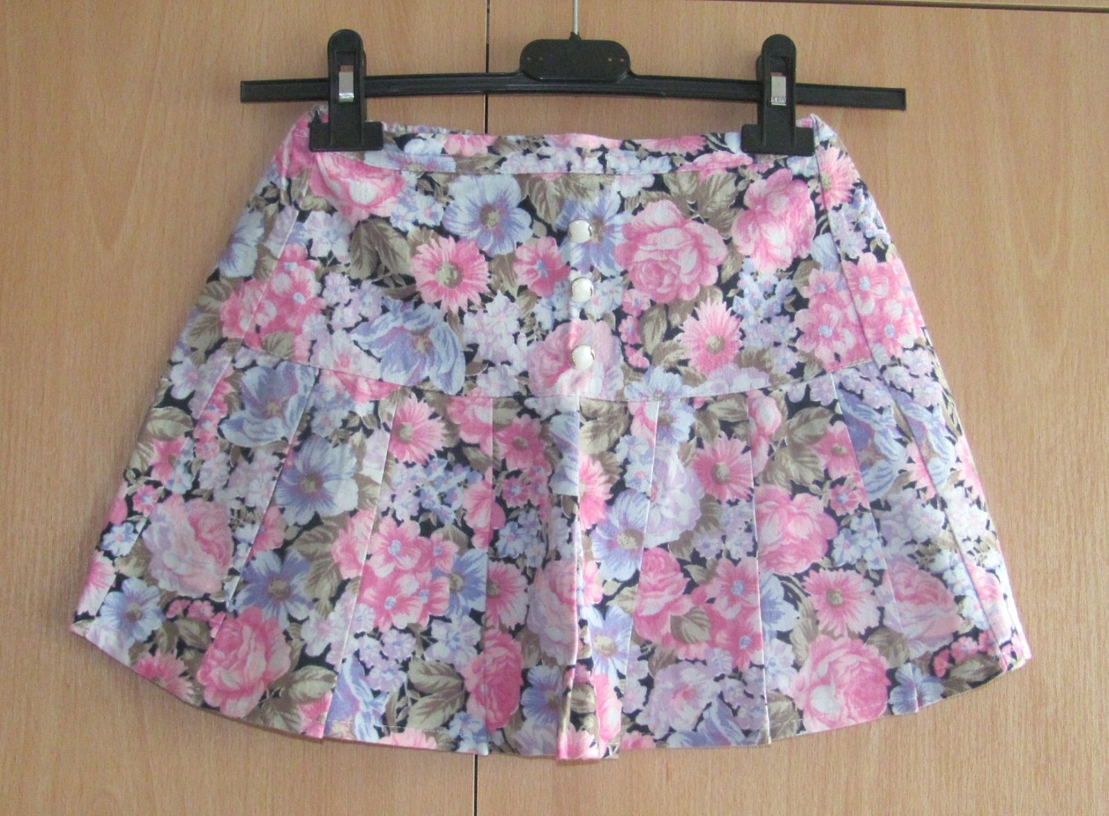 Květovaná minisukně, vpředu pevný pas se sedlem a sklady, vzadu guma. Velikost cca 134/140, pas 27 - 33 cm, délka 31 cm.