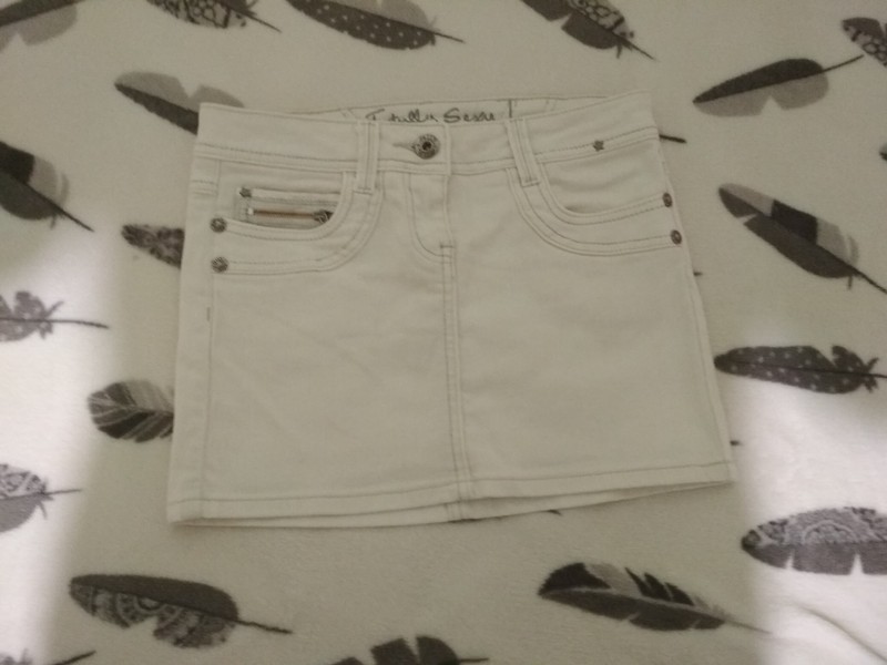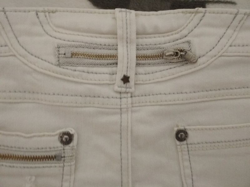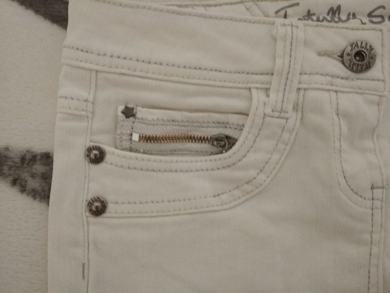 Prodám velmi hezkou moderní krátkou dívčí riflovou sukni zn. Tally Weijl, bílé barvy. Na přední díle u kapsy našitý ozdobný zip, zajímavé detaily i na zadním díle. Velikost 158-164, nošená ale top stav, bez vad. Cena 140,-- Kč.