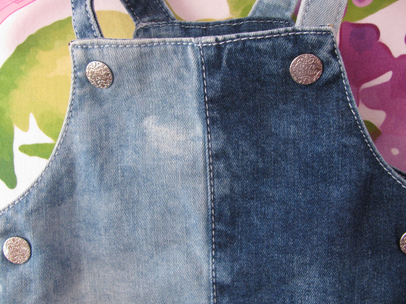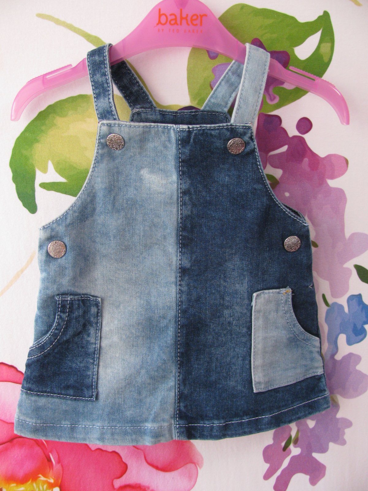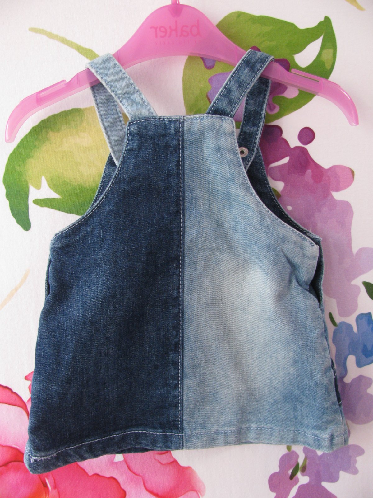 Hezká džínová šatovka, šle a na bocích zap. na druky , kapsičky, 98% bavlna, 2% elastan.Světlejší flíček na prsou , jinak bez vady, jako nové.
