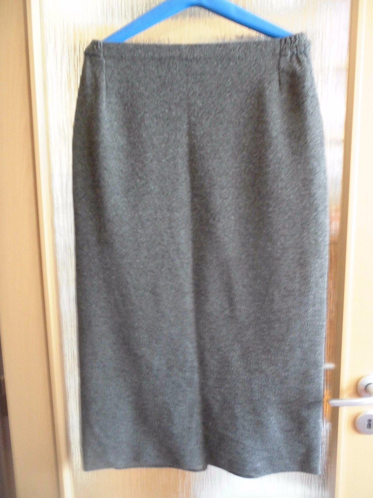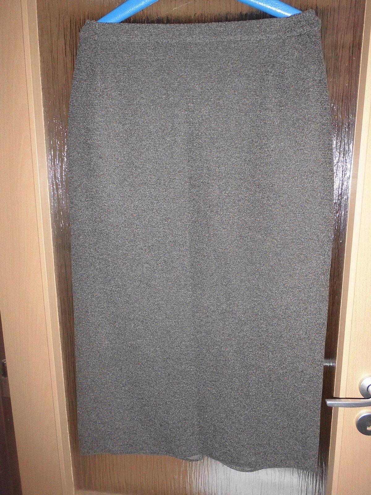 Dlouhá elastická tmavě šedá sukně, velikost odhaduji L-XL, v případě zájmu přeměřím. Na přední straně 2 kapsičky, dole po stranách rozparek.