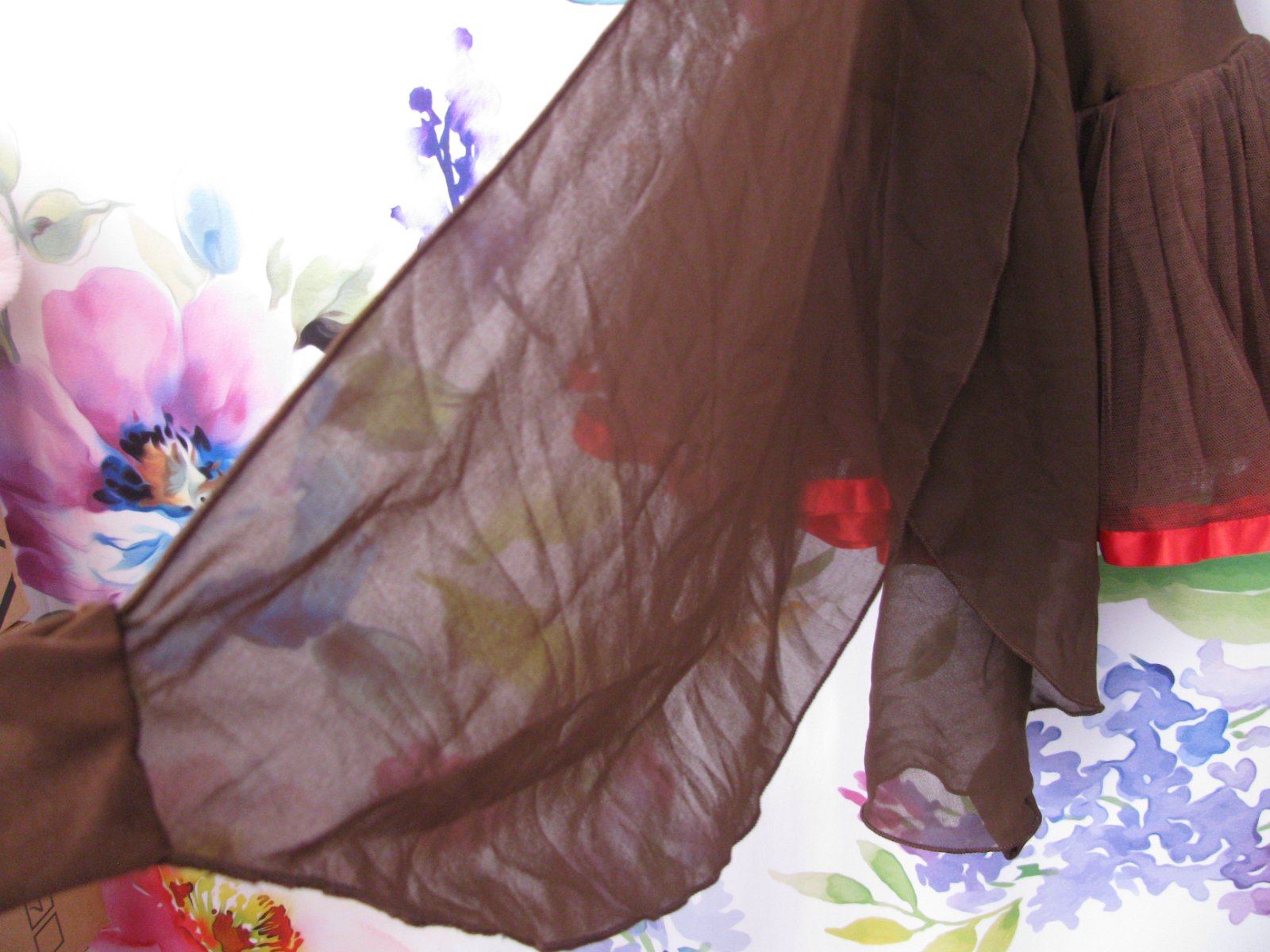 Krásný hnědo červený elastický taneční dres, s tylovou sukní, na zádech přišité tylové pásy s připevněním na ruku, dají se odpárat, na zádech dlouhý zip, 80% nylon, 20% elastan. Top stav bez vady, čisté v mezinoží. Velikost odhadem, proto prosím pečlivě měřte, děkuji.