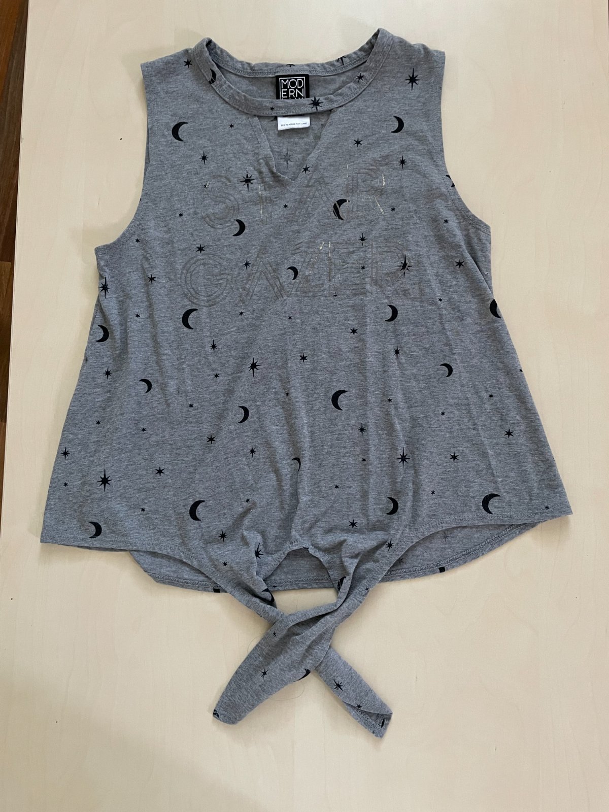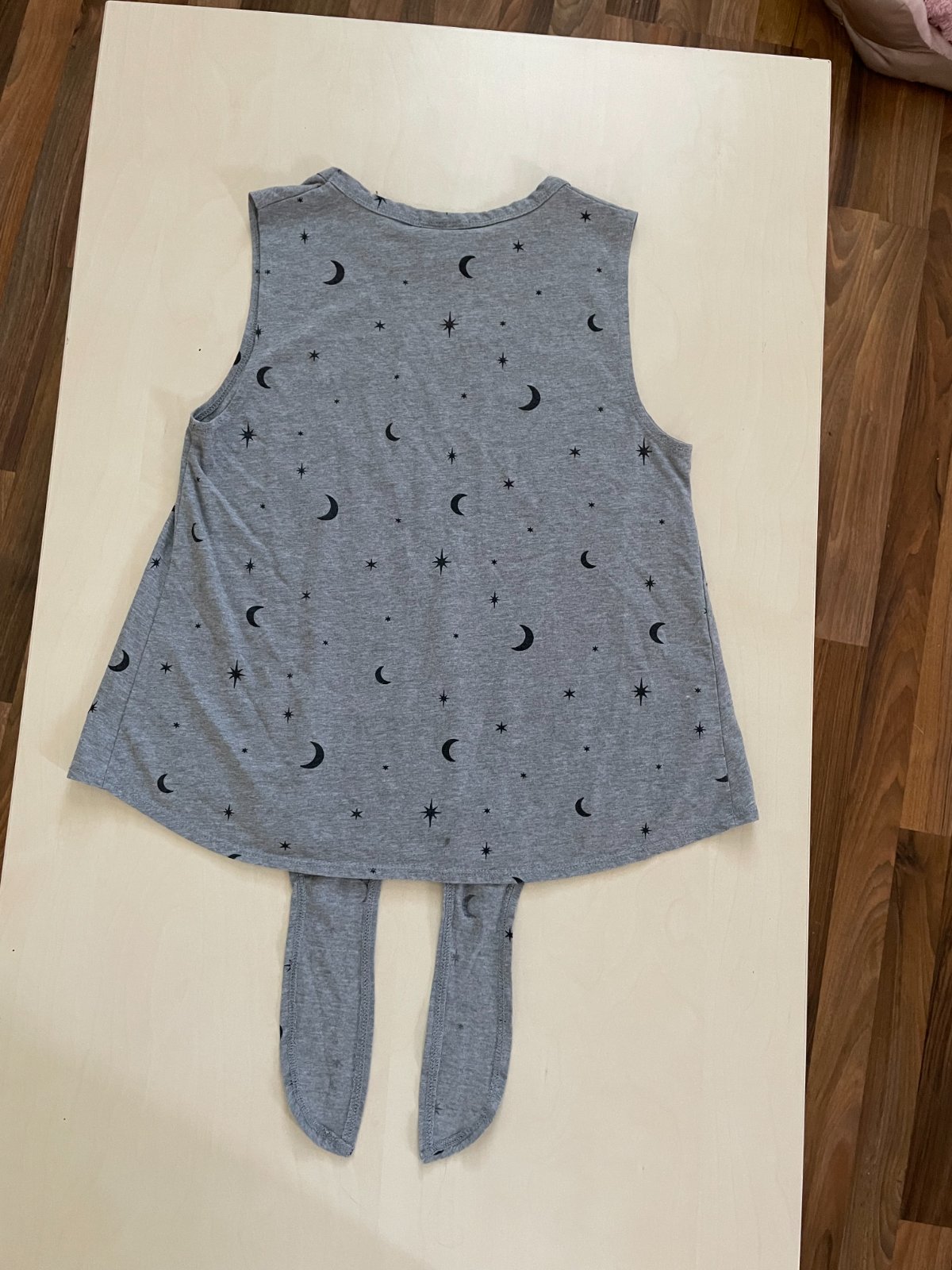 hol. nabízím k prodeji tento šedý top s cípy k úvazu, vel XS, Modern lux. 80% polyester, 20% bavlna. Dcera skoro nenosila, bez vad, krásný