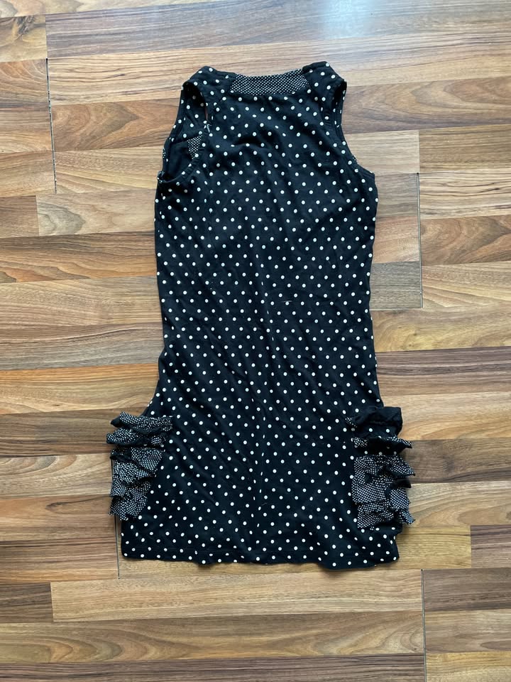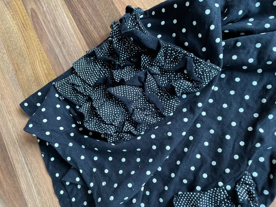 987. nabízím k prodeji tyto krátké puntíkaté šaty s kapsami, jsou krátké a jako šaty pro menší postavu, jinak top. Vel 8 a D34, tedy XS/S, Denim co. Černý základ s puntíky. Do stran našité kapsy s volánky. Materiál 100% bavlna. Koupené dceři, asi ani nenosila, bez vad, krsáné