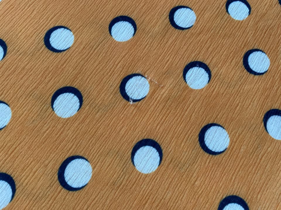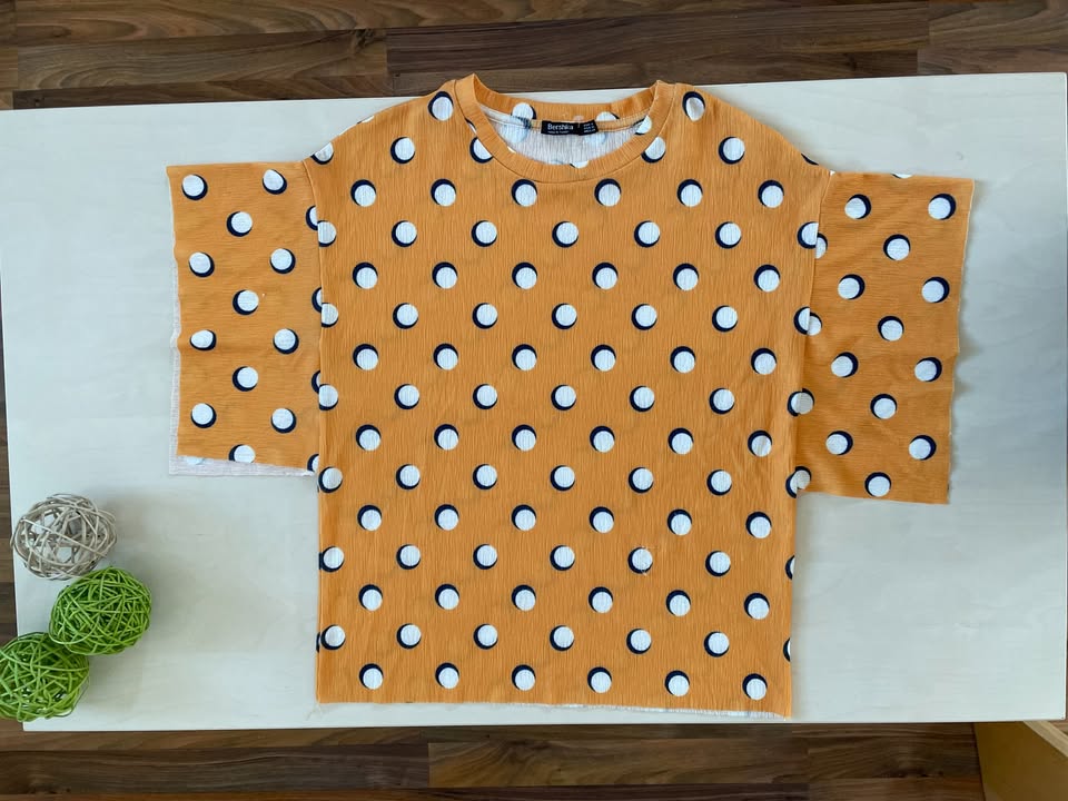 1326. Nabízím k prodeji toto nové triko s vadou, vel XS ale je volné tak klidně i více, Bershka. Barva žlutooranžová s puntíky. Materiál takový strukturovaný mačkáním. Bohužel se na jednom místě zatrhla nit - viz foto, když se začistí, není to tak hodně viditelné jak na fotech v detailu. Barva sytější než na fotu. Nové, až na uvedené bez vad, krsáné
