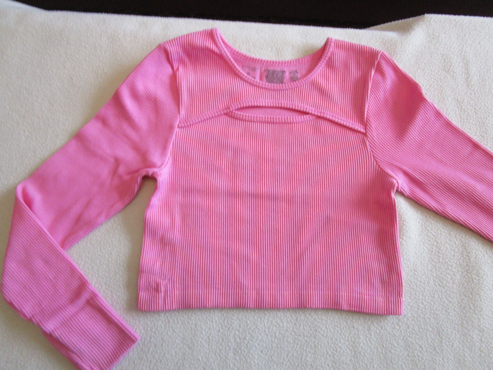 Jako nové zajímavé kratší tm. růžové elast. tričko, dl. rukáv, vel. 140-150, délka 37 cm, cena jen 49 Kč, Primark.