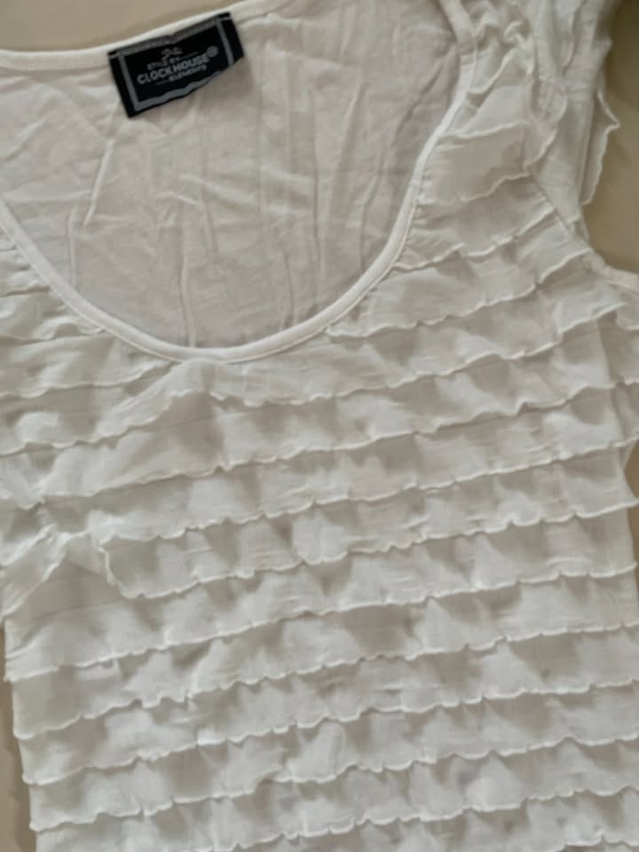 1057. nabízím k prodeji toto bílé volánkové delší triko nebo pro menší minišaty, Clockhouse. Velikost neuvedena, mělo by sednout XS a myslím i S/M. Jako šaty jsou krátké, jako šaty spíše pro menší postavy. Přední díl volánky, zadní díl jako tenká trika. Nošené, bez vad, krásné
