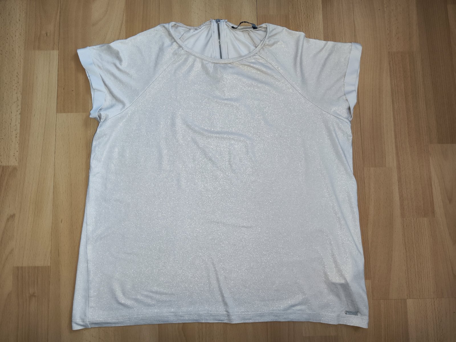 Prodám triko Mohito, velikost M, rozměry - délka od ramen 55 cm; šířka v podpaží 51 cm. Materiál 95% viskóza, 5% elastan. Triko má krémovou barvu, třpytivé. Má kulatý výstřiv, vzadu zip. Spodní lem na jedné straně lehce rozpáraný, jde spravit tak, aby to nebylo poznat, zohledněno v ceně. Cena 70 Kč, v Brně možné osobní předání.