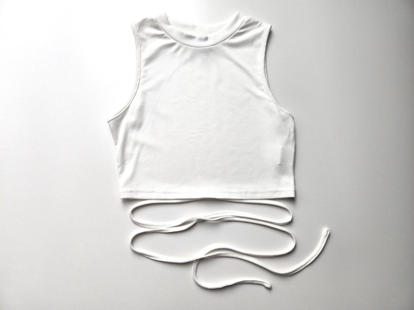 Bílé žebrované pružné tričko bez rukávů zn. SKUE, tkanička kolem břicha.
