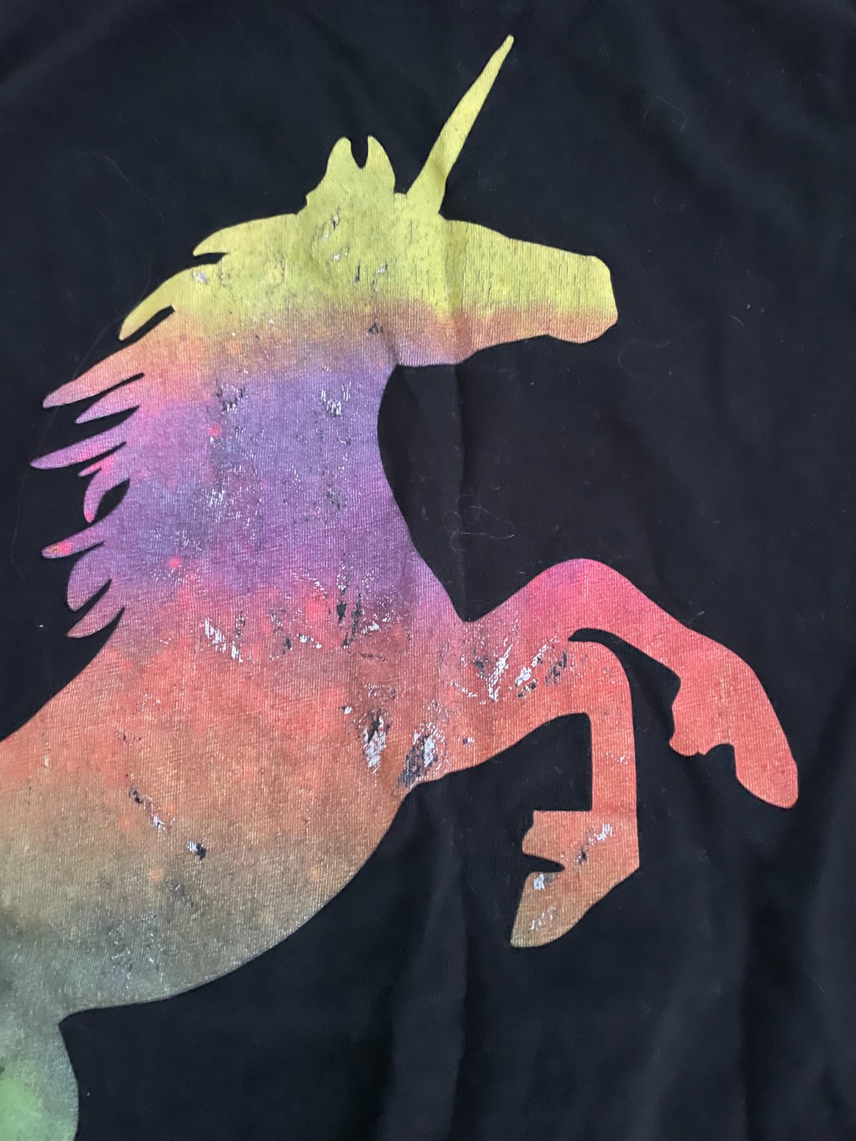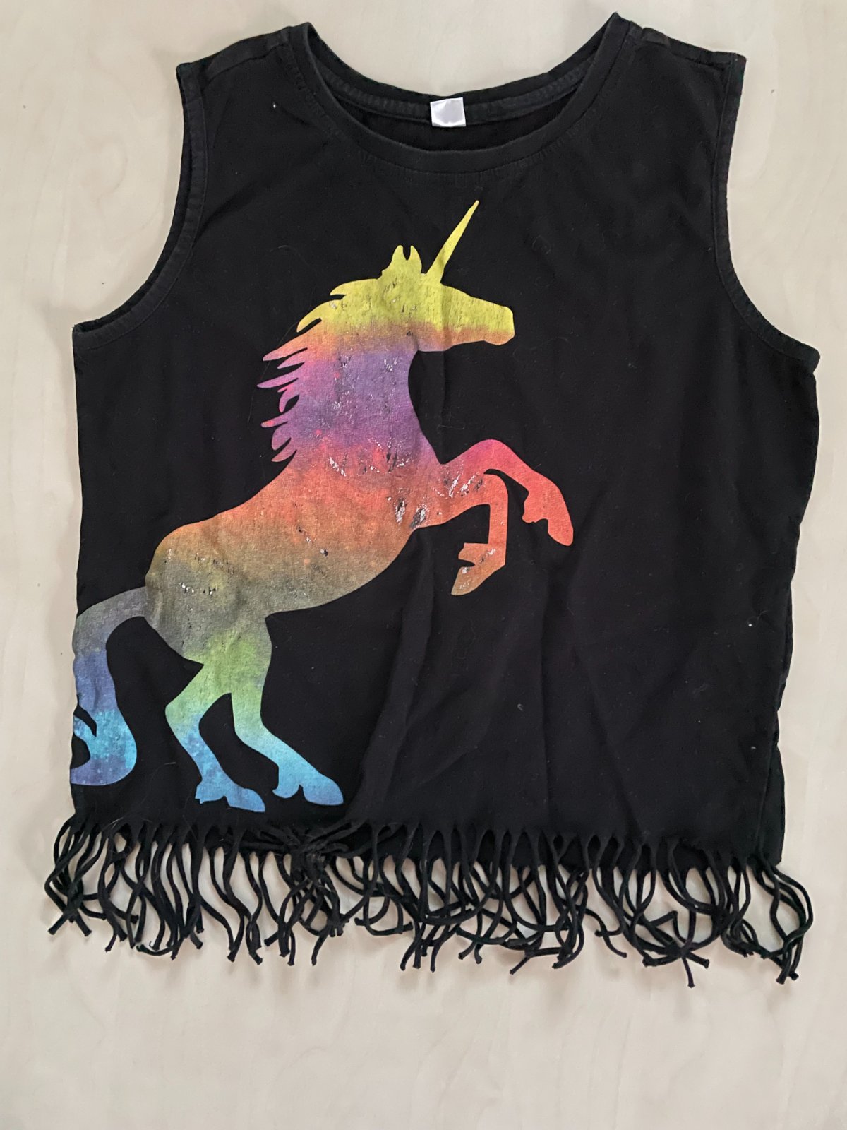 + přidávám triko s jednorožcem, dcera myslím moc nenosila, má narušenou testuru obrázku, je to nažehlené možná tak i bylo - černá sytá.