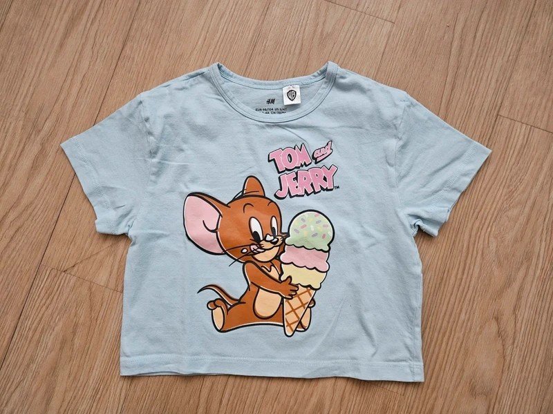 Prodávám kamarádce, tričko z H&M, jako nové, asi oversize střih, velikost 98/104, motiv Tom a Jerry, bez vady
