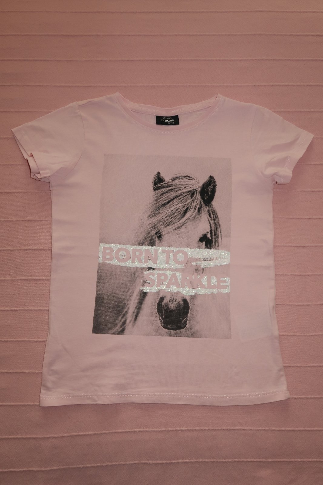Prodám bavlněné triko, délka 49 cm, š 38 cm, délka rukávu 57 cm od krku. Bez dírek a flíčků. Nápis zlaté třpytky.